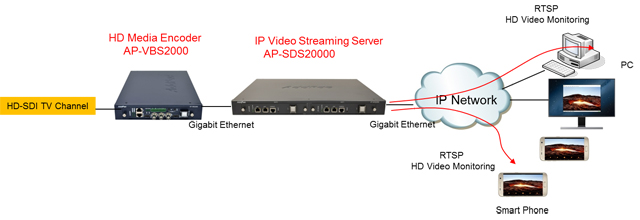 ¾ÖµåÆÅÅ×Å©³î·¯ÁöÀÇ TV ¹æ¼Û ¼ÛÃâ IP ¸ð´ÏÅ͸µ ¼Ö·ç¼ÇÀº AP-VBS2000 HD ºñµð¿À ¹æ¼Û ¹Ìµð¾î ÀÎÄÚ´õ¿Í AP-SDS2000 HD ½ºÆ®¸®¹Ö ¼¹ö¿Í PC ¹× ½º¸¶Æ®Æù¿¡¼ ¹æ¼ÛÇÁ·Î±×·¥À» ¸ð´ÏÅ͸µ ÇÏ´Â ¼ÒÇÁÆ®¿þ¾î·Î ±¸¼ºµÆ½À´Ï´Ù. AP-VBS2000 HD ºñµð¿À ¹æ¼Û ¹Ìµð¾î ¼¹ö´Â H.264 ±â¹ÝÀÇ HD ºñµð¿À ÀÎÄÚ´õ ¸ðµâÀ» ÀåÂøÇÒ ¼ö ÀÖÀ¸¸ç RTSP ±â¹ÝÀÇ Ç¥ÁØ ºñµð¿À ½ºÆ®¸®¹Ö ÇÁ·ÎÅäÄÝÀ» Áö¿øÇÕ´Ï´Ù. HD-SDI ¹× HDMI ºñµð¿À ÀÔ·ÂÀ» Áö¿øÇÏ¿© ¹æ¼Ûä³ÎÀ» ÀÔ·ÂÇÒ¼ö ÀÖµµ·Ï µÇ¾î ÀÖ½À´Ï´Ù. H.264 µîÀ¸·Î ¾ÐÃàµÈ ¿µ»óÀº ¾ÖµåÆÅÀÇ Ã·´Ü QoS ¾Ë°í¸®ÁòÀ» ÅëÇØ µ¥ÀÌÅÍ ÅëÇÕ¸Á¿¡¼µµ ¾ÈÁ¤µÈ °íǰÁú ¿µ»óÀ» Áö¿øÇÕ´Ï´Ù. H.264 ¾ÐÃàÄÚµ¦ ±âÁØÀ¸·Î Full HD, HD±Þ ¿µ»óÀ» IP ¸ð´ÏÅ͸µ ¿ëµµ¿¡ µû¶ó ȸé»çÀÌÁî ¹× ÇÁ·¹ÀÓ·¹ÀÌÆ®¸¦ ¼³Á¤ÇÏ¿© ÀÎÄÚµùÇÒ¼ö ÀÖµµ·Ï ¼³°èµÇ¾ú½À´Ï´Ù. AP-SDS2000 HD ½ºÆ®¸®¹Ö ¼¹ö´Â RTSP ±â¹ÝÀ¸·Î ºñµð¿À ÀÎÄÚµù ºñÆ® ½ºÆ®¸²À» N:M À¸·Î ¶ó¿ìÆÃÇÏ´Â ±â´ÉÀ» ¼öÇàÇÕ´Ï´Ù. AP-SDS2000 HD ½ºÆ®¸®¹Ö ¼¹ö´Â HD ºñµð¿ÀÀÎÄÚ´õ(RTSP Server) ¿¡¼ ¹ß»ýµÇ´Â ºñµð¿À ºñÆ® ½ºÆ®¸²À» ¼ö½ÅÇÏ´Â ÀԷ´ܿ¡¼´Â RTSP Client ±â´ÉÀ» ¼öÇàÇϸç Ãâ·Â´Ü¿¡¼´Â RTSP ¼¹ö±â´ÉÀ» ¼öÇàÇÏ¿© ºñµð¿À µðÄÚ´õ (RTSP Client) ¿¡ On-Demand ·Î ºñµð¿À ºñÆ® ½ºÆ®¸²À» Àü¼ÛÇÒ ¼ö ÀÖµµ·Ï ¼³°èµÇ¾ú½À´Ï´Ù. ÀԷ´ܿ¡¼ÀÇ Transport Layer ÇÁ·ÎÅäÄÝÀº ¾ÈÁ¤µÈ ÆÐŶ ¼ö½ÅÀ» À§Çؼ´Â Mandatory ·Î TCP ÇÁ·ÎÅäÄÝÀ» »ç¿ëÇϰí, RTSP Server Ãâ·Â´Ü¿¡¼´Â ºñµð¿À µðÄÚ´õ °°Àº ¼ö½Å´ÜÀÇ ´Ù¾çÇÑ ÀÀ¿ë¼ºñ½º¿¡ À¯¿¬ÇÏ°Ô ´ëÀÀÇÒ ¼ö ÀÖµµ·Ï Option À¸·Î TCP ¶Ç´Â UDP ÇÁ·ÎÅäÄÝÀ» µ¿½Ã¿¡ Á¦°øÇÒ ¼ö ÀÖµµ·Ï ¼³°èµÇ¾ú½À´Ï´Ù. PC ³ª ½º¸¶Æ®Æù¿¡¼ÀÇ VLC °°Àº ÇÁ·Î±×·¥Àº RTP Ŭ¶óÀÌ¾ðÆ®·Î µ¿ÀÛÇÏ¿© AP-SDS2000 ½ºÆ®¸®¹Ö ¼¹ö¿¡ ¿¬°áµÇ¾î ¹æ¼Ûä³ÎÀ» ¸ð´ÏÅ͸µÇÒ ¼ö ÀÖ½À´Ï´Ù. ¾ÖµåÆÅÅ×Å©³î·ÎÁö´Â »ç¿ëÀÚ ¸¸Á·À» À§Çؼ TV ¹æ¼Û ¼ÛÃâ IP ¸ð´ÏÅ͸µ ¼Ö·ç¼ÇÀº ¸¸À» Á¦°øÇÏ´Â º¥´õ°¡ ¾Æ´Ï¶ó, °í°´ÀÇ ³×Æ®¿öÅ© ȯ°æ¿¡ ÀûÇÕÇÑ ´Ù¾çÇÑ IP-PBX, VoIP ¹× ¹Ìµð¾î °ÔÀÌÆ®¿þÀÌ, °¢Á¾ IP¿Àµð¿À/ºñµð¿À ´Ü¸»±â, ¿ÜÀåÇü ¿Àµð¿À/ºñµð¿À MCU, È»óȸÀÇÀåºñ, IP ¿Àµð¿À/ºñµð¿À ¹æ¼Û, ³×Æ®¿öÅ© DVR, ¿Àµð¿À/ºñµð¿À ³ìÃë ¼Ö·ç¼Ç, Æ®·¡ÇÈ ÄÁÆ®·Ñ·¯ QoS Àåºñ ¼Ö·ç¼Ç µî ´Ù¾çÇÑ Àåºñ±ºÀ» ÇÔ²² Áö¿øÇÕ´Ï´Ù. ´Ù°¡¿À´Â ALL IP ±â¹ÝÀÇ ¸ÖƼ¹Ìµð¾î ÅÚ·¹Æ÷´Ï ȯ°æÀº ´Ù¾çÇÑ ¿Àµð¿À/ºñµð¿À ÀÚ¿øµéÀÌ IP ³×Æ®¿öÅ© »ó¿¡¼ °°ÀÌ »ç¿ëµÇ°í °øÀ¯µÇ¾î¾ß Çϱ⠶§¹®¿¡ ¿µ¿ªº° ¼Ö·ç¼Ç ÅëÇÕ ¹× Àüü ¼Ö·ç¼Ç ÅëÇÕÀÌ ¸Å¿ì Áß¿äÇÏ°Ô µË´Ï´Ù. ¾ÖµåÆÅ TV ¹æ¼Û ¼ÛÃâ IP ¸ð´ÏÅ͸µ ¼Ö·ç¼ÇÀº ÀÌ·¯ÇÑ ¸ÖƼ¹Ìµð¾î ÅëÇÕ ¼Ö·ç¼ÇÀ» °í·ÁÇÏ¿© ¼³°èµÇ¾úÀ¸¸ç °í°´ÀÇ ´Ù¾çÇÑ ¼ºñ½º ¿å±¸¸¦ ¸¸Á· ½Ãų ¼ö ÀÖ½À´Ï´Ù.