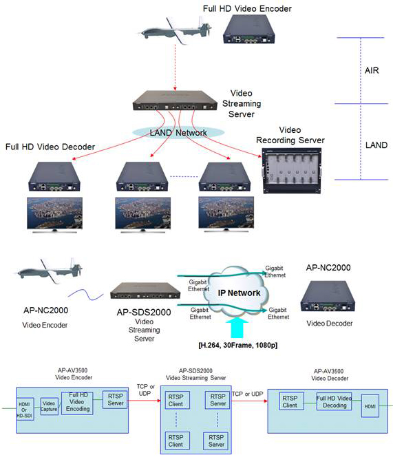 ¾ÖµåÆÅÅ×Å©³î·¯ÁöÀÇ ¿¡¾îÅõ·£µå(AIR-to-LAND) Ç® HD ºñµð¿À Àü¼Û ¼Ö·ç¼ÇÀº AP-NC2000 Ç® HD ºñµð¿À ÀÎÄÚ´õ/µðÄÚ´õ, AP-SDS2000 ºñµð¿À ½ºÆ®¸®¹Ö¼¹ö, AP-SDRS5000 ºñµð¿À ÀúÀå¼¹ö·Î ±¸¼ºµÇ¾îÀÖ½À´Ï´Ù. Ç® HD ºñµð¿À ÀÎÄÚ´õ/µðÄÚ´õ´Â AP-NC2000 Çϵå¿þ¾î Ç÷¿Æ÷¿È¿¡ AV35000 Ç® HD ºñµð¿À ¹æ¼Û ÀÎÄÚ´õ/µðÄÚ´õ ¸ðµâ·Î ±¸¼ºµÇ¾î ÀÖ½À´Ï´Ù ÃÖ½ÅÀÇ H.264 ºñµð¿À ÄÚµ¦À» »ç¿ëÇϸç HD-SDI, HDMI, Analog CVBSÀÔ·Â/Ãâ·ÂÀ» Á¦°øÇÕ´Ï´Ù. ¾ÖµåÆÅ IP Ç® HD ºñµð¿À Àü¼Û ÀåÄ¡´Â ¾ÖµåÆÅÀÌ Á÷Á¢ ¼³°è °³¹ßÇÑ °í¼º´É DSP Çϵå¿þ¾î¿Í °í¼º´É ÇÁ·Î¼¼¼¸¦ °áÇÕÇØ Ç® HD°íǰÁú ¿µ»óÀ» ½Ç½Ã°£À¸·Î ÀÎÄÚµù/µðÄÚµù Àü¼ÛÇÒ ¼ö ÀÖ½À´Ï´Ù. µå·Ð °°Àº ´Ù¾çÇÑ ÀÀ¿ëºÐ¾ß¿¡¼ IP ±â¹ÝÀÇ ½Ç½Ã°£ Ç®HD ±Þ ¿µ»ó Àü¼Û ºÐ¾ß¿¡ Àû¿ëÇÒ ¼ö ÀÖ½À´Ï´Ù. AV6000N ¾ÖµåÆÅ Full HD ±Þ IP ºñµð¿À Àü¼Û ÄÚµ¦Àº AV3500 ÀÇ ¾÷±×·¹À̵åµÈ ¸ðµ¨ÀÌ¸ç »õ·Ó°Ô Ãß°¡ÀûÀ¸·Î °³¹ßµÈ ÄÚµ¦ ¸ðµ¨ÀÔ´Ï´Ù. 󸮼º´ÉÀÌ ºü¸¥ °í¼º´É ¸ðµ¨ÀÔ´Ï´Ù. ¶ÇÇÑ H.264 AVC ÄÚµ¦¿Ü¿¡ Temporal domain H.264 SVC (scalable video coding)ºñµð¿À ÄÚµ¦µµ Áö¿øÇÕ´Ï´Ù. AP-SDS2000 ÀÓº£µðµå ±â¹ÝÀÇ HD ºñµð¿À ºÐ¹è ¼¹öÀÔ´Ï´Ù. RTSP ÇÁ·ÎÅäÄÝ ±â¹ÝÀ¸·Î ºñµð¿À ÀÎÄÚ´õ¿Í ºñµð¿À µðÄÚ´õ »çÀÌ¿¡ À§Ä¡ÇÏ¿© HD ºñµð¿À ºñÆ® ½ºÆ®¸²À» ºÐ¹èÇÏ´Â ±â´ÉÀ» Áö¿øÇÕ´Ï´Ù. 6Mbps ±ÞÀÇ HD ºñµð¿À ºñÆ® ½ºÆ®¸²À» ÀÔ·Â 32ä³Î Ãâ·Â 64ä³Î±îÁö Áö¿øÇÕ´Ï´Ù. AP-SDS2000 Àº Large Scale Network DVR ±¸Ãà¿¡ ÃÖÀûÈ µÇµµ·Ï Master-Slave ±â¹ÝÀ¸·Î ¼³°èµÇ¾î È®À强ÀÌ ¶Ù¾î³³´Ï´Ù. ¿µ»ó°¨½Ã?±³Åë°ü¸®?ȯ°æ/¹æÀç°¨½Ã µî ´Ù¾çÇÑ ½Ç½Ã°£ ¿µ»ó ÀÀ¿ëºÐ¾ß¿¡ Àû¿ëÇÒ ¼ö ÀÖ½À´Ï´Ù. AP-SDS2000 HD ºÐ¹è¼¹ö´Â HD ºñµð¿ÀÀÎÄÚ´õ(RTSP Server) ¿¡¼ ¹ß»ýµÇ´Â ºñµð¿À ºñÆ® ½ºÆ®¸²À» ¼ö½ÅÇÏ´Â ÀԷ´ܿ¡¼´Â RTSP Client ±â´ÉÀ» ¼öÇàÇϸç Ãâ·Â´Ü¿¡¼´Â RTSP Server ±â´ÉÀ» ¼öÇàÇÏ¿© ºñµð¿À µðÄÚ´õ (RTSP Client) ¿¡ On-Demand ·Î ºñµð¿À ºñÆ® ½ºÆ®¸²À» Àü¼ÛÇÒ ¼ö ÀÖµµ·Ï ¼³°èµÇ¾ú½À´Ï´Ù. ÀԷ´ܿ¡¼ÀÇ Transport Layer ÇÁ·ÎÅäÄÝÀº ¾ÈÁ¤µÈ ÆÐŶ ¼ö½ÅÀ» À§Çؼ´Â Mandatory ·Î TCP ÇÁ·ÎÅäÄÝÀ» »ç¿ëÇϰí, RTSP Server Ãâ·Â´Ü¿¡¼´Â ºñµð¿À µðÄÚ´õ °°Àº ¼ö½Å´ÜÀÇ ´Ù¾çÇÑ ÀÀ¿ë¼ºñ½º¿¡ À¯¿¬ÇÏ°Ô ´ëÀÀÇÒ ¼ö ÀÖµµ·Ï Option À¸·Î TCP ¶Ç´Â UDP ÇÁ·ÎÅäÄÝÀ» µ¿½Ã¿¡ Á¦°øÇÒ ¼ö ÀÖµµ·Ï ¼³°èµÇ¾ú½À´Ï´Ù. AP-SDRS5000 Àº Â÷¼¼´ë °í¼º´É ³×Æ®¿öÅ© ±â¹ÝÀÇ µðÁöÅÐ ºñµð¿À ·¹ÄÚµù ¹× ÇÁ·Î¼¼½Ì Àåºñ·Î HD±Þ ¹× D1±Þ ºñµð¿À ÀúÀå ¼¹öÀÔ´Ï´Ù. RTSP ÇÁ·ÎÅäÄÝ ±â¹ÝÀ¸·Î HD ºÐ¹è¼¹ö¿¡ Á¢¼ÓÇÏ¿© ¸ÖƼä³Î HD/D1 ¿µ»óÁ¤º¸¸¦ ÀúÀåÇÏ´Â ±â´ÉÀ» ¼öÇàÇÏ´Â ¼¹öÀÔ´Ï´Ù. AP-SDRS5000 Àº Large Scale Network DVR ±¸Ãà¿¡ ÃÖÀûÈ µÇµµ·Ï ¼³°èµÇ¾î È®À强ÀÌ ¶Ù¾î³³´Ï´Ù. ¿µ»ó°¨½Ã?±³Åë°ü¸®?ȯ°æ/¹æÀç°¨½Ã µî ´Ù¾çÇÑ ½Ç½Ã°£ ¿µ»ó ÀÀ¿ëºÐ¾ß¿¡ Àû¿ëÇÒ ¼ö ÀÖ½À´Ï´Ù. AP-SDRS5000 ³×Æ®¿öÅ© ÀúÀå¼¹ö´Â Network DVR ½Ã½ºÅÛ±¸Á¶¿¡¼ RTSP ±â¹ÝÀ¸·Î ºñµð¿À ÀÎÄÚµù ºñÆ® ½ºÆ®¸²À» Çϵåµð½ºÅ©¿¡ ÀúÀå/Àç»ýÇÏ´Â ±â´ÉÀ» ¼öÇàÇÕ´Ï´Ù. 5°³ÀÇ SATA Çϵåµð½ºÅ©¸¦ ÀåÂøÇÒ ¼ö ÀÖÀ¸¸ç, 2 Tera Çϵåµð½ºÅ©¸¦ »ç¿ëÇÏ´Â °æ¿ì´Â ÃÖ´ë 10 Tera ÀúÀå¿ë·®À» Áö¿øÇÒ ¼ö ÀÖ½À´Ï´Ù. AP-SDRS5000 HD/D1 ÀúÀå¼¹ö´Â HD±Þ ºñµð¿À ºñÆ® ½ºÆ®¸²°ú D1 ºñµð¿À ºñÆ®½ºÆ®¸² ÀúÀåÀ» ±âº»ÀûÀ¸·Î Áö¿øÇÕ´Ï´Ù. ¸®´ª½º ±â¹ÝÀÇ »ó¿ë¼¹ö Ç÷¿ÆûÀ» »ç¿ëÇÏ¸ç ºÐ¹è¼¹ö ÀÏüÇü°ú ºÐ¸®Çü ŸÀÔÀ» µÑ ´Ù Áö¿øÇÒ ¼ö ÀÖµµ·Ï ¼³°èµÇ¾ú½À´Ï´Ù.