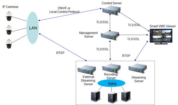 Â÷¼¼´ë ¾ÖµåÆÅ Smart VMS ´Â Áß´ëÇü ±Ô¸ðÀÇ ³×Æ®¿öÅ© CCTV ¼Ö·ç¼Ç¿¡¼ ÁöÀÚü, °ø°ø±â°ü, ±ºµî ´Ù¾çÇÑ ºÐ¾ß¿¡¼ ´ë±Ô¸ðÀÇ IP Ä«¸Þ¶ó¸¦ Á¾ÇÕÀûÀ¸·Î ¿î¿µ °ü¸® ÇÏ´Â ÇÙ½É ºñµð¿À °ü¸®½Ã½ºÅÛ ÀÔ´Ï´Ù. ½Ã½ºÅÛ ¾ÈÁ¤¼º ¹× Fault Tolerant ¼ºñ½º ´ëºñ¸¦ À§Çؼ ÁÖ¿ä±â´ÉÀ» ´ã´çÇÏ´Â ¼¹öµéÀº ÀÌÁßÈ ±¸¼º ¹× ¸ðµâ·Î ±¸¼ºÀ¸·Î ¼³°è µÇ¾ú½À´Ï´Ù. ÁÖ¿ä¼¹öµéÀº ºñµð¿À ½ºÆ®¸®¹Ö ºÐ¹è ¹× ÀúÀåÀ» ´ã´çÇÏ´Â ¼¹ö, Ä«¸Þ¶ó PTZÁ¦¾î, Åõ¾î¸µ, ¿ÀÅä¸ÞÀÌ¼Ç ¸¦ ´ã´çÇÏ´Â Á¦¾î¼¹ö, µµ¸ÞÀÎ °ü¸® ¹× °¢°¢ÀÇ »ç¿ëÀÚ ÀÎÅÍÆäÀ̽º¸¦ ´ã´çÇÏ´Â °ü¸® ¼¹ö, CCTV °ü¸®ÀÚµéÀÌ ¿î¿µÇÏ´Â ¿µ»óÇ¥Ãâ °°Àº °üÁ¦ PC ¼ÒÇÁÆ®¿þ¾î µé·Î ±¸¼ºµÇ¾î ÀÖ½À´Ï´Ù. ·ÎÄ÷£ ¸ÁÀ̳ª °øÁ߸ÁÀ» ÅëÇØ¼ ¿¬°áµÈ ÁÖ¿ä¼¹öµéÀº TLS Àü¼Û°èÃþ º¸¾È ÇÁ·ÎÅäÄÝÀ» »ç¿ëÇÏ¿© ¿ÜºÎ·Î ºÎÅÍÀÇ Ä§ÀÔÀ̳ª ÇØÅ·¿¡ ´ëºñÇØ ¾ÈÀüÇÑ Åë½ÅÀ» Áö¿øÇÕ´Ï´Ù.