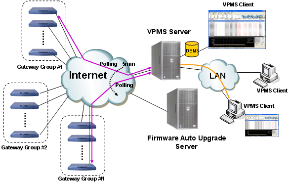VoiceFinder AP-VPMS(VoIP Plug & Play Management System)´Â ÀÚµ¿À¸·Î VoIP °ÔÀÌÆ®¿þÀÌÀÇ ±â´É ¼³Á¤°ú ÀÛµ¿ »óŸ¦ üũÇÒ ¼ö ÀÖ´Â PnP VoIP ÅëÇÕ °ü¸® ½Ã½ºÅÛÀ¸·Î¼ ´ë±Ô¸ð VoIP °ÔÀÌÆ®¿þÀÌ ½Ã½ºÅÛÀÇ ¼³Ä¡, °ü¸®¸¦ ÇÊ¿ä·Î ÇÏ´Â VoIP ¸Á »ç¾÷ÀÚ ¶Ç´Â °ü¸®ÀÚ¸¦ À§ÇÑ VoIP °ÔÀÌÆ®¿þÀÌ ÅëÇÕ°ü¸® ¼Ö·ç¼ÇÀÔ´Ï´Ù. AP-VPMS´Â ÇÑ °÷¿¡¼ ¼ö¸¹Àº VoIP °ÔÀÌÆ®¿þÀÌÀÇ Ãʱâ ȯ°æ ¼³Á¤ ¡¤ ¿î¿µÁßÀÎ OS ¹öÀü üũ ¹× ¾÷±×·¹ÀÌµå ¡¤ ¼³Á¤ ÆÄÀÏ ¾÷·Îµå ¡¤ ÀÛµ¿»óÅ ¸ð´ÏÅ͸µÀ» ½±°Ô ÇÒ ¼ö ÀÖ´Â ÅëÇÕ °ü¸® ½Ã½ºÅÛÀÌÀÚ °í°´Áö¿ø µµ±¸·Î¼ ¿ø°ÝÁö VoIP °ÔÀÌÆ®¿þÀÌÀÇ ¸ðµ¨À» ÀÚµ¿À¸·Î °Ë»öÇØÁÖ°í, ȯ°æ ¼³Á¤ÆÄÀϰú ¿î¿µÁßÀÎ OS ¹öÀüÀ» ÀϰýÀûÀ¸·Î º¸¿©Áֱ⠶§¹®¿¡ Àü¹® ¿î¿ë¿ä¿øÀÌ ¼³Ä¡ÇöÀåÀ¸·Î ÃâÀåÀ» °¡¾ßÇÏ´Â °æÁ¦Àû, ½Ã°£ÀûÀÎ ºñ¿ë°ú ¸¹Àº ºñ¿ë ¹× ½Ã°£ÀÌ ¿ä±¸µÇ´Â ¼ÒÇÁÆ®¿þ¾î ¾÷±×·¹À̵å¿Í ±¸¼º ÆÄÀÏÀÇ º¯°æÀ» ¿ø°Ý¿¡¼ ½±°í Æí¸®ÇÏ°Ô ÇØ°áÇÒ ¼ö ÀÖ½À´Ï´Ù. AP-VPMS´Â ±âº»ÀûÀ¸·Î Àü¹® ¼³Ä¡¿ä¿øÀÌ ¾Æ´Ï¶ó ÀϹݻç¿ëÀÚ°¡ VoIP °ÔÀÌÆ®¿þÀ̸¦ ¼³Ä¡Çϵµ·Ï ¼³°èµÇ¾úÀ¸¸ç VoIP ÀÏ¹Ý »ç¿ëÀÚ°¡ VoIP °ÔÀÌÆ®¿þÀ̸¦ ÆíÀÇÁ¡ °°Àº °÷¿¡¼ ±¸¸ÅÇÏ¿© VoIP ¼ºñ½º°¡ °¡´ÉÇϵµ·Ï ½±°Ô ¼³Ä¡ ÇÒ ¼ö ÀÖ°Ô ÇÏ¿© ÁÝ´Ï´Ù. VoIP °ÔÀÌÆ®¿þÀÌ ¼³Ä¡´Â °í°´ÀÇ ´Ù¾çÇÑ ¼ºñ½º ½Åû¹æ¹ý¿¡ µû¶ó ´Þ¶óÁú ¼ö ÀÖÀ¸¸ç, º°µµÀÇ ¼³Ä¡ÀÚ³ª ÀνºÅç·¯ ÇÁ·Î±×·¥ÀÌ ¾ø¾îµµ ¿ø°ÝÁö¿¡ ÀÖ´Â VoIP °ÔÀÌÆ®¿þÀ̰¡ ¼ºñ½º µÉ ¼ö ÀÖµµ·Ï AP-VPMS¼¹ö°¡ ÀÚµ¿À¸·Î Ãʱ⠼³Á¤À» ÇÕ´Ï´Ù. ¶ÇÇÑ ½Ç½Ã°£À¸·Î ¿ø°ÝÁö¿¡ ÀÖ´Â VoIP °ÔÀÌÆ®¿þÀÌÀÇ »óŸ¦ ±×·¡ÇÁ ¹× Å×À̺í ÇüÅ·ΠÁ¦°øÇÏ¿© VPMS °ü¸®ÀÚ°¡ ½±°í Æí¸®ÇÏ°Ô ÆÄ¾Ç ÇÒ ¼ö ÀÖ°ÔÇÏ¿© ƯÁ¤ VoIP °ÔÀÌÆ®¿þÀÌ¿¡ ¹®Á¦ ¹ß»ý½Ã ºü¸¥ ´ëó´É·Â¸¦ È®º¸ÇÏ°Ô ÇÕ´Ï´Ù. VPMS·Î °ü¸®´ÜÀ§¸¦ ¼³Á¤ÇÑ ±×·ì´ÜÀ§¿¡ ´ëÇØ¼ ¶Ç´Â °³º° VoIP °ÔÀÌÆ®¿þÀÌ¿¡ AP-VPMS °ü¸®ÀÚÀÇ ÀÛ¾÷À» ÃÖ¼ÒÈ ÇÏ¸é¼ VoIP °ÔÀÌÆ®¿þÀÌÀÇ ¼ÒÇÁÆ®¿þ¾î ¾÷±×·¹À̵å¿Í ±¸¼º ÆÄÀÏÀÇ º¯°æÀ» ¼öÇà ÇÒ ¼ö ÀÖÀ¸¸ç º¯°æ History¸¦ °ü¸® ÇÔÀ¸·Î½á º¯°æÀÌ·ÂÀ» ¸íÈ®ÇÏ°Ô º¸¿©ÁÝ´Ï´Ù. º¸¿©Áö´Â ¿©·¯°¡Áö Åë°è ÀÚ·á ¹× ¸®½ºÆ®´Â ÇÁ¸°Æ®ÇÏ¿© º¼ ¼ö ÀÖÀ¸¸ç ÀÚüÀûÀ¸·Î ÅÚ³Ý (Telnet) ¹× FTP ±â´ÉÀ» Á¦°øÇÏ¿© º°µµÀÇ ÇÁ·Î±×·¥À» »ç¿ëÇÏ´Â ¹ø°Å·Î¿òÀ» ¾ø¾Ý½À´Ï´Ù. °³°³ÀÇ VoIP °ÔÀÌÆ®¿þÀÌ¿¡ ´ëÇØ¼ ÀÏÀÏÀÌ Telnet°ú FTPÀÇ Id, Password¸¦ ¸ô¶óµµ ÀÚµ¿À¸·Î ·Î±×ÀÎÇÏ¿© º¹ÀâÇÑ º¯°æ ÀÛ¾÷À» ÇÒ ¼ö ÀÖ°Ô ÇÕ´Ï´Ù. AP-VPMS ´Â µ¥½ºÅ©Åé PC ±Þ Çϵå¿þ¾î¸¦ »ç¿ëÇÏ¿© °¡Àå °æÀï·ÂÀÖ´Â ºñ¿ëÀ¸·Î ÃÖ°íÀÇ È¿°ú¸¦ ´©¸± ¼öÀÖ½À´Ï´Ù.