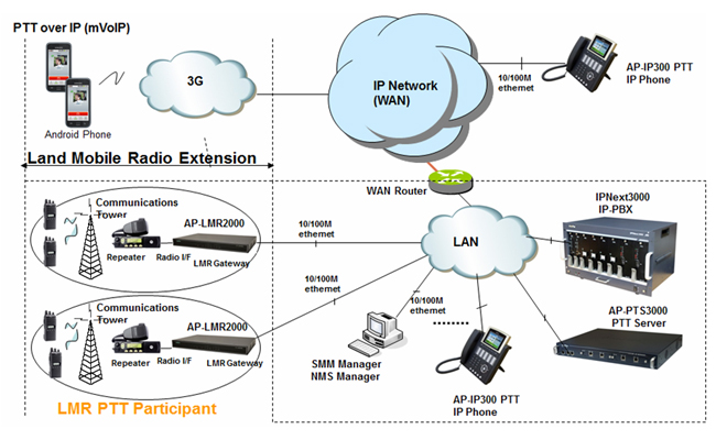 3G ½º¸¶Æ®Æù°ú ¹«Àü±â¸Á ¿¬µ¿ ±×·ìÄÝ (PTT over IP) ÅäÅÐ ¼Ö·ç¼Ç ¾ÖµåÆÅÅ×Å©³î·¯ÁöÀÇ PTT over IP ¼Ö·ç¼ÇÀº 3G ½º¸¶Æ®Æù(mVoIP)°ú ±âÁ¸ ¹«Àü±â¸Á ¿¬µ¿µî ´Ù¾çÇÑ À¯¹«¼± ³×Æ®¿öÅ© ȯ°æ¿¡¼ »ç¿ëµÉ ¼ö ÀÖ´Â PTT ±×·ìÄÝ ¼ºñ½º ÅäÅÐ ¼Ö·ç¼ÇÀÔ´Ï´Ù. SIP ±â¹ÝÀÇ ¾ÖµåÆÅ ±×·ìÄÝ ¼Ö·ç¼ÇÀº Â÷¼¼´ë IP-PBX ÀÎ IPNext3000, AP-PTS3000 PTT ¼¹ö, ¹«Àü±â ¿¬µ¿ LMR(Land-to-Mobile Radio) Gateways, WiFi IP Àüȱâ, ¾Èµå·ÎÀÌµå ±â¹ÝÀÇ ½º¸¶Æ®Æù SIP PTT ¾îÇÃ, PTT IP Àüȱâ, ¸Á°ü¸® ½Ã½ºÅÛ NMS(Network Management System) µîÀ¸·Î ±¸¼ºµÇ¾î ÀÖ½À´Ï´Ù. ¾ÖµåÆÅÀÇ ±×·ìÄÝ ¼Ö·ç¼ÇÀº IP ±â¹ÝÀ¸·Î ¼³°èµÇ¾î 3G ¸ð¹ÙÀÏÀ» Æ÷ÇÔÇÑ À¯¹«¼± ÅëÇÕ ¹× À§¼ºÅë½Å ÀÀ¿ëÀÌ °¡´ÉÇϸç, Àå¼Ò¿¡ »ó°ü¾øÀÌ ÀÏ´ëÀÏ ¹× ±×·ìÄÝ ¼ºñ½º¸¦ Á¦°øÇÒ ¼ö ÀÖÀ¸¸ç VoIP ±â¼úÀ» »ç¿ëÇϱ⠶§¹®¿¡ Åë½Å¿ä±ÝÀ» Àý¾àÇÒ ¼ö ÀÖ´Ù. ¶ÇÇÑ ¹«Àü±â¸Á ¿¬µ¿ ±â´ÉÀ» Á¦°øÇÏ¿© ±âÁ¸ÀÇ ¹«Àü±â¸ÁÀÇ ¼³ºñ ¹× ÀåÁ¡À» ±×´ë·Î À¯Áö ÇÒ ¼ö ÀÖ´Â°Ô ÀåÁ¡ÀÌ´Ù. 3G ½º¸¶Æ®Æù ¾îÇÃÀ» »ç¿ëÇÏ¿© ¹«Àü±â¸ÁÀÇ Ä¿¹ö¸®Áö¸¦ Àü±¹¸ÁÀÎ 3G ¸ÁÀ¸·Î È®ÀåÇÏ¿© ±×·ìÄÝ ¼ºñ½º¸¦ Á¦°øÇÒ ¼ö ÀÖ½À´Ï´Ù. È®À强ÀÌ ¶Ù¾î³ª¼ IP-PBX ÀÇ °¡ÀÔÀÚ ¿ë·®°ú PTT ¼¹öÀÇ ´ë¼ö¸¦ ´Ã¸®¸é À¯¹«¼± PTT ¼ºñ½º °¡ÀÔÀÚ¸¦ ´Ã¸± ¼ö ÀÖµµ·Ï ¼³°èµÇ¾ú½À´Ï´Ù.. ƯÈ÷ ¾Èµå·ÎÀÌµå ½º¸¶Æ®Æù ¾îÇÃÀº 3G(mVoIP), WiFi µà¾ó¸ðµå¸¦ Áö¿øÇÒ ¼ö ÀÖ°í, ¾ÖµåÆÅÀÇ VoIP Á¦Ç°±º¿¡¼ ¿À·£¼¼¿ù °ËÁõµÈ SIP Ç¥ÁؽÅÈ£ ü°è¸¦ »ç¿ëÇϱ⠶§¹®¿¡ ȣȯ¼º ¹× È®À强ÀÌ ¶Ù¾î³³´Ï´Ù.