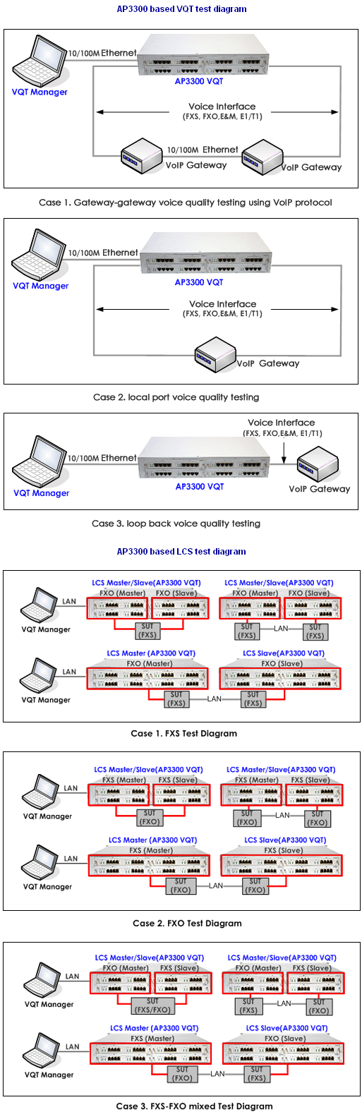 VoiceFinder AP3300 VQT(Voice Quality Tester) ½Ã½ºÅÛÀº ¾Æ³¯·Î±× FXS/FXO/E&M°ú µðÁöÅÐ E1/T1 ÀÎÅÍÆäÀ̽º¸¦ ÀÌ¿ëÇØ VoIP ÀåºñÀÇ Æ®·¡ÇÈ Ã³¸®¼º´ÉÀ» ÃøÁ¤¡¤ºÐ¼®ÇÏ´Â LCS(Local Call Simulator) ±â´É°ú PESQ/PESQ-LQ/PESQ-LQO(MOS) ¾Ë°í¸®Áò µîÀ» ÀÌ¿ëÇØ À½¼ºÇ°ÁúÀ» ÃøÁ¤ÇÏ´Â VQT(Voice Quality Tester) ±â´ÉÀ» Áö¿øÇÏ´Â ¼Ö·ç¼ÇÀÔ´Ï´Ù. AP3300 VQT ½Ã½ºÅÛÀº PC¿¡¼ ¿î¿µµÇ´Â VQT Manager¿Í AP3300 ÀÓº£µðµå ½Ã½ºÅÛÀ¸·Î ±¸¼ºµÇ¸ç, ´Ù¾çÇÑ Å×½ºÆ® ½Ã³ª¸®¿À¸¦ ÅëÇØ VoIP ÀåºñÀÇ Æ®·¡ÇÈ Ã³¸®¼º´É°ú À½¼ºÇ°ÁúÀ» ÃøÁ¤ÇÒ ¼ö ÀÖ½À´Ï´Ù. µ¿½Ã¿¡ ¸¹Àº ¼öÀÇ VoIP Àåºñ¿¡ ´ëÇØ 󸮼º´É°ú À½¼ºÇ°ÁúÀ» Å×½ºÆ®ÇÒ ¶§ 1´ëÀÇ VQT Manager¿¡¼ ¿©·¯ ´ëÀÇ AP3300 ÀÓº£µðµå ½Ã½ºÅÛÀ» ÅëÇÕ Á¦¾îÇÒ ¼ö ÀÖ¾î ¶Ù¾î³ ¼º´É°ú È®À强À» °âºñÇÑ ½Ã½ºÅÛÀÔ´Ï´Ù. »ç¿ë¹æ¹ý ¶ÇÇÑ ½¬¿ö, Æí¸®ÇÑ GUI ±â¹ÝÀÇ VQT Manager¸¦ ÅëÇØ Àü¹® Áö½ÄÀÌ ¾ø´Â Ãʺ¸ÀÚµµ VoIP Àåºñ Å×½ºÆ® °á°ú¸¦ Åë°è¡¤ºÐ¼®ÀÌ °¡´ÉÇÕ´Ï´Ù.