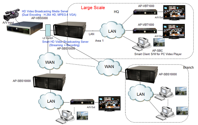 Ãʰí¼Ó ÀÎÅÍ³Ý °°Àº ³×Æ®¿öÅ©ÀÇ ±¤´ë¿ªÈ (BcN; Broadband convergence Network)¿¡ µû¶ó VoIP(Voice over IP) À½¼º µ¥ÀÌÅÍ ÅëÇÕ ¹°°áÀ» ³Ñ¾î HD±Þ °íǰÁú ¿µ»ó ¹æ¼Û ¼¼»óÀÌ º»°ÝÀûÀ¸·Î ÆîÃÄÁö°í ÀÖ½À´Ï´Ù. ±×µ¿¾È À½¼ºµ¿º¸ ¹× SD ¿µ»ó¹æ¼Û ½Ã½ºÅÛ¿¡ ¸Ó¹°°í ÀÖ¾ú´Ù¸é, ÀÌÁ¦ HD¿µ»ó ¹æ¼Û ºÐ¾ß·Î °í°³¸¦ µ¹¸®½Ê½Ã¿À. ¸ÖƼ¹Ìµð¾î¿Í µ¥ÀÌÅÍ Åë½Å ÅëÇÕÀÇ ¼±µÎÁÖÀÚ ¾ÖµåÆÅÀÌ ¿µ»ó¡¤À½¼º¡¤µ¥ÀÌÅÍ ÅëÇÕÀÇ »õ·Î¿î ºñÀüÀ» Á¦½ÃÇÕ´Ï´Ù. ¾ÖµåÆÅÀÇ IP ±â¹Ý HDºñµð¿À¹æ¼Û ¼Ö·ç¼ÇÀº °í¼º´É HDºñµð¿À¹æ¼Û ¼¹ö, HD ºñµð¿À ¹æ¼Û ¹Ìµð¾î ¼¹ö¸¦ Áß½ÉÀ¸·Î HDºñµð¿À ¹æ¼Û Å͹̳Î, PC ±â¹ÝÀÇ Smart Broadcasting ClientµéÀÌ ¿¬°áµÅ ¿©·¯ ÁöÁ¡À¸·Î °íÈÁúÀÇHD¿µ»ó ¹× À½¼º¹æ¼ÛÀ» ½Ç½Ã°£ ¹×On-Demand ¹æ¼ÛÀ¸·Î ¼ÛÃâÇÏ´Â Â÷¼¼´ë HD ¹æ¼Û¼¹ö ¼Ö·ç¼ÇÀÔ´Ï´Ù. AP-SBS10000 HD ºñµð¿À ¹æ¼Û ¼¹ö´Â IP ±â¹ÝÀÇ HD ºñµð¿À ¹æ¼Û ¼¹ö Àåºñ·Î RTSP ÇÁ·ÎÅäÄÝÀ» »ç¿ëÇÏ¿© ½Ç½Ã°£ ¹æ¼Û ½ºÆ®¸®¹Ö ¼ºñ½º ¹× ¹æ¼Û ³ìÈ ¼ºñ½º ±â´ÉÀ» Á¦°øÇÕ´Ï´Ù. ½Ç½Ã°£ ¹æ¼ÛÀÌ ³¡³ ÈÄ¿¡µµ PC ±â¹ÝÀÇ Smart Broadcasting Client ¼ÒÇÁÆ®¿þ¾î¸¦ »ç¿ëÇÏ¿© »ç¿ëÀÚ PC ¿¡¼ Video on Demand ¼ºñ½º¸¦ Á¦°øÇÕ´Ï´Ù. 1Æ÷Æ®ÀÇ 10/100/1000Mbps ±â°¡ºñÆ® ÀÌ´õ³Ý ÀÎÅÍÆäÀ̽º, 4°³ÀÇ Hard DiskÀåÂø ÀÎÅÍÆäÀ̽º Á¦°øÇÏ¿©, ÀÇȸÁß°è. ¼³±³¹æ¼Û. ¿ø°Ý°ÀÇ. »ç³»¹æ¼Û µî ´Ù¾çÇÑ IP ±â¹ÝÀÇ ½Ç½Ã°£ ¶Ç´Â On-Demand HD ±Þ ¿µ»ó ¹æ¼Û ºÐ¾ß¿¡ Àû¿ëÇÒ ¼ö ÀÖ½À´Ï´Ù. °í¼º´É HD ±Þ ¹æ¼Û ¼¹ö AP-SBS10000 °í¼º´É HD ¹æ¼Û¼¹ö´Â Network±â¹ÝÀÇ IP ¹æ¼Û ½Ã½ºÅÛ±¸Á¶¿¡¼ RTSP ±â¹ÝÀ¸·Î ¹æ¼Û ¹Ìµð¾î ¼¹ö·ÎºÎÅÍ ¾ÐÃàµÈ H.264ºñµð¿À ºñÆ® ½ºÆ®¸²À» ¼ö½ÅÇÏ¿© ½Ç½Ã°£À¸·Î ´Ùä³Î ¹æ¼ÛÇÏ´Â ±â´ÉÀ» Á¦°øÇÕ´Ï´Ù. ¶ÇÇÑ µ¿½Ã¿¡ Video On Demand ¼ºñ½º¸¦ À§ÇÏ¿© Çϵåµð½ºÅ©¿¡ ºñµð¿À ³ìȱâ´ÉÀ» Á¦°øÇÏ¿© »ç¿ëÀÚ ¿ä±¸½Ã¿¡ PC ¿¡¼ ¹æ¼Û ³ìÈ ÆÄÀÏÀ» Àç»ýÇÏ´Â ±â´ÉÀ» ¼öÇàÇÕ´Ï´Ù. 4°³ÀÇ SATA Çϵåµð½ºÅ©¸¦ ÀåÂøÇÒ ¼ö ÀÖÀ¸¸ç, 2 Tera Çϵåµð½ºÅ©¸¦ »ç¿ëÇÏ´Â °æ¿ì´Â ÃÖ´ë 8Tera ÀúÀå¿ë·®À» Áö¿øÇÒ ¼ö ÀÖ½À´Ï´Ù. HD ±Þ ¹× SD ±Þ ¿µ»óÀ» µ¿½Ã Á¦°øÇÒ ¼ö ÀÖµµ·Ï ¼³°èµÇ¾î Ãʱ⿡ Àü¼Û´ë¿ªÆøÀÌ ÀÛÀº °æ¿ì¿¡´Â SD ±ÞÀ¸·Î »ç¿ëÇÏ´Ù°¡ HD ±ÞÀ¸·Î »ç¿ëÇÒ ¼ö ÀÖ½À´Ï´Ù. ¸®´ª½º ±â¹ÝÀÇ Ç÷¿ÆûÀ» »ç¿ëÇÏ¸ç ¾ÈÁ¤¼ºÀ» ³ô¿´½À´Ï´Ù. RTSP Server-Client °³³äÀÇ HD ½Ç½Ã°£ ¹æ¼Û ¼¹ö AP-SBS10000 HD ¹æ¼Û ¼¹ö´Â HD ¹æ¼Û ¹Ìµð¾î ¼¹ö(AP-VBS5000,6000,7000 RTSP Server) ¿¡¼ ¹ß»ýµÇ´Â ºñµð¿À ºñÆ®½ºÆ®¸²(bit stream)À» ¼ö½ÅÇÏ´Â ÀԷ´ܿ¡¼´Â RTSP Client ±â´ÉÀ» ¼öÇàÇÕ´Ï´Ù. HD ¹æ¼Û ¹Ìµð¾î ¼¹ö·Î ºÎÅÍ ¼ö½ÅµÈ ¾ÐÃàµÈ ¿µ»óÁ¤º¸´Â ´Ùä³Î HD ¹æ¼Û¼¹ö½º¸¦ À§ÇؼHD ¹æ¼Û¼¹öÀÇ Ãâ·Â´Ü¿¡¼´Â RTSP Server ±â´ÉÀ» ¼öÇàÇÏ¿© HDºñµð¿À Å͹̳Î(RTSP Client) ¿¡ ºñµð¿À ºñÆ® ½ºÆ®¸²À» Àü¼ÛÇÒ ¼ö ÀÖµµ·Ï ¼³°èµÇ¾ú½À´Ï´Ù. ¾ÖµåÆÅ HD ¹æ¼Û¼¹ö ÀԷ´ܿ¡¼ÀÇ Transport Layer ÇÁ·ÎÅäÄÝÀº ¾ÈÁ¤µÈ ÆÐŶ ¼ö½ÅÀ» À§Çؼ´Â Mandatory ·Î TCP ÇÁ·ÎÅäÄÝÀ» »ç¿ëÇϰí, RTSP Server Ãâ·Â´Ü¿¡¼´Â HD¹æ¼ÛÅ͹̳Π°°Àº ¼ö½Å´ÜÀÇ ´Ù¾çÇÑ ÀÀ¿ë¼ºñ½º¿¡ À¯¿¬ÇÏ°Ô ´ëÀÀÇÒ ¼ö ÀÖµµ·Ï Option À¸·Î TCP ¶Ç´Â UDP ÇÁ·ÎÅäÄÝÀ» µ¿½Ã¿¡ Á¦°øÇÒ ¼ö ÀÖµµ·Ï ¼³°èµÇ¾ú½À´Ï´Ù. ½Ç½Ã°£ HD ¶óÀÌºê ¿µ»ó¡¤À½¼ºµ¿º¸ ½Ã´ë °³¸· ¾ÖµåÆÅ HD±Þ IP ºñµð¿À ¹æ¼Û¼¹ö´Â ¶Ù¾î³ ¼º´É°ú ¾ÈÁ¤¼ºÀ» ±â¹ÝÀ¸·Î Áö±Ý±îÁöÀÇ ¿µ»ó ¼Ö·ç¼Ç¿¡¼ ²Þ²Ù±â ¾î·Á¿ü´ø °íǰÁúÀÇ ½Ç½Ã°£ ¿µ»óÀÇ ¼¼°è¸¦ ÆîÃÄÁÝ´Ï´Ù. AP-VBS7000, AP-VBS6000, AP-VBS5000 HDºñµð¿À ¹æ¼Û ¹Ìµð¾î¼¹ö¿Í, AP-SBS10000 HD ¹æ¼Û¼¹ö, AP-VBT1000 HDºñµð¿À ¹æ¼Û ´Ü¸»Àº Çϵå¿þ¾î ÄÚµ¦°ú °í¼º´É RISC CPU ±â¹ÝÀÇ ÀÓº£µðµå ½Ã½ºÅÛÀ¸·Î ¼³°èµÅ °íǰÁú ¿µ»óÀ» ½Ç½Ã°£ Àü¼Û¡¤Àç»ýÇÒ ¼ö Àִ ÷´Ü ÀåºñÀÔ´Ï´Ù. H.264·Î ¾ÐÃàµÈ ¿µ»óÀº ¾ÖµåÆÅÀÇ Ã·´Ü QoS ¾Ë°í¸®ÁòÀ» ÅëÇØ µ¥ÀÌÅÍ ÅëÇÕ¸Á¿¡¼µµ ¾ÈÁ¤µÈ °íǰÁú ¿µ»óÀ» Áö¿øÇÕ´Ï´Ù. H.264¾ÐÃàÄÚµ¦ ±âÁØÀ¸·Î HD(1280x720)±Þ ¿µ»óÀ» ÃÊ´ç 30ÇÁ·¹ÀÓ±îÁö ó¸®ÇØ 1~4Mbps Àü¼Û ´ë¿ªÆøÀ¸·Î HDTV±Þ ¿µ»óÀ» IP ³×Æ®¿öÅ© ȯ°æ¿¡¼ ½ÇÇöÇß½À´Ï´Ù. ƯÈ÷ ³×Æ®¿öÅ© »óÅ¿¡ µû¶ó ÇÁ·¹ÀÓ ·¹ÀÌÆ®¿Í ÀûÀýÇÑ ºñÆ® ·¹ÀÌÆ®¸¦ ÁöÁ¤ÇÒ ¼ö ÀÖ¾î ³·Àº ´ë¿ªÆøÀÇ È¯°æ¿¡¼ºÎÅÍ ³ôÀº Àü¼Û ´ë¿ªÆøÀÇ ³×Æ®¿öÅ© ȯ°æ±îÁö Æø³Ð°Ô ¼ö¿ëÇÕ´Ï´Ù.