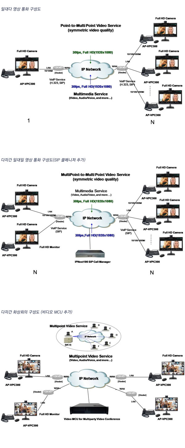 AP-VPC300 Àüȱ⽺ŸÀÏ µ¥½ºÅ©Å¾¿ë Ç® HD ±Þ È»óȸÀÇ ºñµð¿À ÄÚµ¦Àº ¿ÜÀåÇü Ç® HD Ä«¸Þ¶ó¿Í Ç® HDTV ¶Ç´Â ¸ð´ÏÅ͸¦ ¿¬°áÇØ Ç×»ó ÃֽŠ»ç¾çÀÇ ¸ð´ÏÅÍ¿Í Ä«¸Þ¶ó¸¦ »ç¿ëÇÏ¸é¼ ÀÎÅͳÝÀ» ÀÌ¿ëÇØ °íÈÁú¡¤°íÀ½ÁúÀÇ ºñµð¿À Åë½ÅÀÌ °¡´ÉÇÑ Ç® HD±Þ IP È»óȸÀÇ¿ë ÄÚµ¦ÀÔ´Ï´Ù. ÃÖ½ÅÀÇ ¿Àµð¿À/ºñµð¿À ÄÚµ¦°ú HDMI ÀÔÃâ·Â ÀÎÅÍÆäÀ̽º¸¦ ÅëÇØ È»óȸÀÇ, È»óÀüÈ µîÀ» ÃÖÀûÀ¸·Î Áö¿øÇÕ´Ï´Ù. HDMI ÀÔ·Â ÀÎÅÍÆäÀ̽º´Â ¿ÜºÎÀÇ PTZ Áö¿ø HD È»óȸÀÇÄ«¸Þ¶ó ¿¬°áÀ» Áö¿øÇÒ ¼ö ÀÖÀ¸¸ç, HDMI ºñµð¿À Ãâ·Â ÀÎÅÍÆäÀ̽º¸¦ ÅëÇÏ¿© ¿ÜºÎ¿¡ HDTV¸¦ ¿¬°á ´ëȸéÀ¸·Î ºñµð¿À ȸéÀ» º¼¼ö ÀÖ½À´Ï´Ù. ÀÌÁ¦ ºñµð¿À ÄÚµ¦ÀÇ ¼±Åà ±âÁØÀº ¼Û¼öȱⰡ ÀåÂøµÈ ±âÁ¸ ÀüȱâÀÇ Æí¸®ÇÑ ±â´É¿Ü¿¡ Ç® HD±Þ È»óȸÀÇ ±â´ÉÀ» Áö¿øÇÒ ¼ö ÀÖ¾î¾ß ÇÕ´Ï´Ù. ºê·Îµå¹êµå ³×Æ®¿öÅ© ½Ã´ë´Â Ç® HD ¿µ»óÅë½ÅÀ¸·Î ÅëÇÕ´Ï´Ù. ¾ÖµåÆÅ AP-VPC300 Àüȱ⽺ŸÀÏ Ç® HD ¿µ»óȸÀÇÀåºñ´Â ±âÁ¸ ¿µ»ó ¼Ö·ç¼ÇÀÇ Æ²À» ±ü ÷´Ü ¿µ»ó ¼Ö·ç¼ÇÀÔ´Ï´Ù. ¿ÜºÎ HDMIÄ«¸Þ¶ó, ¿ÜºÎ Ç® HD ¸ð´ÏÅ͸¦ ¿¬°áÇØ ¿µ»óȸÀÇ´Â µî ´Ù¾çÇÑ ºÐ¾ß¿¡ Àû¿ëÀÌ °¡´ÉÇÕ´Ï´Ù. Table 1. AP-VPC300ÀÇ ´Ù¾çÇÑ È°¿ë ¼ºñ½º ±¸ºÐ ¼ºñ½º ¼³¸íÇÊ¿äÇÑ ¿¬°áÀåÄ¡ ¿µ»óȸÀǵ¥½ºÅ©»ó¿¡¼ »ó´ë¹æÀÇ ½Ç½Ã°£ ¿µ»óÀ» º¸¸é¼ ¿µ»óȸÀÇ °¡´É, Ç® HD ¸ð´ÏÅÍ È¸éÀ» ÅëÇØ ¿µ»óÅë½Å ¹× ¿µ»óȸÀÇ °¡´É ¡¤¿ÜºÎ HDMI PTZ ºñµð¿À È»óȸÀÇ Ä«¸Þ¶ó ¡¤¿ÜºÎ HDMI ºñµð¿À Ä«¸Þ¶ó ¡¤¿ÜºÎ HDMI Ç® HD ¸ð´ÏÅÍ ¿ÜºÎ HDMI ¸ð´ÏÅÍ¿Í HDMI Ä«¸Þ¶ó·Î ÀÎÅͳÝÀ» ÀÌ¿ëÇÑ´Ù AP-VPC300 Àüȱ⠽ºÅ¸ÀÏ Ç® HD±Þ ¿µ»óÄÚµ¦Àº HDMI ÀÔÃâ·Â ÀÎÅÍÆäÀ̽º¸¦ »ç¿ëÇÏ¿© ´ëÇü LCDȸ鿡¼ ½Ã¿øÇÏ°Ô Áñ±â´Â Ç®HD 1080P(1920 x 1080) ¿µ»óÅë½ÅÀÌ °¡´ÉÇÕ´Ï´Ù. °í¼º´É DSP ±â¹ÝÀÇ Ç® HD ¿µ»óȸÀÇ Àåºñ ¾ÖµåÆÅ AP-VPC300 Àüȱ⠽ºÅ¸ÀÏ Ç® HD ¿µ»óȸÀÇ Àåºñ´Â °í¼º´É ºñµð¿ÀDSP ±â¹ÝÀÇ Çϵå¿þ¾î ±¸Á¶·Î ¼³°èµÇ¾î, ÀÏ´ëÀÏ (Point-to-Point) ¿µ»óÅëȸ¦ À§ÇÑ ½Ç½Ã°£ ¿Àµð¿À/ºñµð¿À ÀÎÄÚµù, µðÄÚµù 󸮱â´ÉÀ» Á¦°øÇÕ´Ï´Ù. ´ÙÀÚ°£ ȸÀÇ ±â´ÉÀ» À§ÇÏ¿© ¾ÖµåÆÅÀÇ MCU Àåºñ¿Í ¿¬µ¿±â´ÉÀ» Á¦°øÇÏ¿© Áß¾Óó¸® ÁýÁß¹æ½ÄÀÇ 1:N ´ÙÀÚ°£ ¿µ»ó ȸÀǸ¦ ±â´ÉÀ» Á¦°øÇÒ ¼ö ÀÖ½À´Ï´Ù. AP-VPC300 Ç® HD ¿µ»óȸÀÇ ½Ã½ºÅÛÀº ¿ÜºÎ MCU ¿¬µ¿ ±â´ÉÀ» ÅëÇÏ¿© ´Ù¾çÇÑ Å¸ÀÔÀÇ ºñµð¿À ÄÁÆÛ·±½º ¸ðµå¸¦ Áö¿øÇÕ´Ï´Ù. Meet-Me(Dial-In) ¹æ½ÄÀ» ºñ·ÔÇÏ¿© Ad-Hoc(On-Demand) ¹æ½Ä ¹× Scheduled ºñµð¿À ÄÁÆÛ·±½º ¹æ½ÄÀ» Áö¿øÇÕ´Ï´Ù. ÀÏ´ëÀÏ ¿µ»óÅëÈ ¹× MCU ¿µ»óȸÀǽà »ç¿ëÇÏ´Â VoIP ½Ã±×³Î¸µÀº SIP ¹× H.323 À» Áö¿øÇÕ´Ï´Ù. H.264 ºñµð¿À ÄÚµ¦, HDMI ºñµð¿À ÀÔ·ÂÀÎÅÍÆäÀ̽º, HDMI ºñµð¿À Ãâ·Â ÀÎÅÍÆäÀ̽º, 2Æ÷Æ® ±â°¡ºñÆ® ÀÌ´õ³Ý ÀÎÅÍÆäÀ̽º µî ÷´Ü ±â´É°ú ¼ºñ½º¸¦ Á¦°øÇÕ´Ï´Ù. Æß¿þ¾î ¾÷±×·¹ÀÌµå °¡´ÉÇÑ ±¸Á¶ AP-VPC300ÀÇ °í¼º´É ºñµð¿À DSP´Â ¸ðµÎ ÇÁ·Î±×·¡¸Óºí ±¸Á¶À̱⠶§¹®¿¡ Áö¼ÓÀûÀÎ ±â´É°³¼±À̳ª º¯°æ, Ãß°¡°¡ °¡´ÉÇÕ´Ï´Ù. ±â´ÉÃß°¡, º¯°æÀÌ ÀÖÀ» ¶§¸¶´Ù Á÷Á¢ ȨÆäÀÌÁö¿¡¼ ´Ù¿î¹Þ°Å³ª ÀÚµ¿ ¾÷±×·¹ÀÌµå ¿É¼ÇÀ» ÁöÁ¤Çصθé, º°µµ ¼ö°í¸¦ ÇÒ ÇÊ¿ä¾øÀÌ ÃÖ½ÅÀÇ ±â´ÉÀ» ÀÌ¿ëÇÒ ¼ö ÀÖ½À´Ï´Ù. ¼ÒÇÁÆ®¿þ¾î ¾÷±×·¹À̵带 ÅëÇØ ÇöÀçÀÇ H.264 ÄÚµ¦»Ó ¾Æ´Ï¶ó ¼º´ÉÀÌ Çâ»óµÈ ÄÚµ¦ ¹× »õ·Î¿î ÄÚµ¦ ¼ºñ½º±îÁö ¹ÞÀ» ¼ö ÀÖ½À´Ï´Ù.. Ç® HD±Þ ¿µ»óÀ» ÃÊ´ç 30ÇÁ·¹ÀÓÀ¸·Î Àü´Þ AP-VPC300 Ç® HD ¸ð´ÏÅÍ Å¸ÀÔ ¿µ»óȸÀÇ ½Ã½ºÅÛÀº H.264 (MPEG-4 Part10) ¿µ»ó¾ÐÃàÄÚµ¦ ±âÁØÀ¸·Î 1080P (1920 x 1080) ±Þ ¿µ»óÀ» ÃÊ´ç 30ÇÁ·¹ÀÓ±îÁö ó¸®ÇÕ´Ï´Ù. ¶§¹®¿¡ ÀÏ¹Ý SD±Þ ºñµð¿À ÄÚµ¦¿¡¼ ´À³¥ ¼ö ¾ø´ø »ý»ýÇÑ ÈÁúÀ» HDTV µð½ºÇ÷¹ÀÌ È¸éÀ» ÅëÇØ¼ ´À³¥ ¼ö ÀÖ½À´Ï´Ù. AP-VPC300 Ç® HD È»óȸÀÇ¿ë ºñµð¿ÀÄÚµ¦Àº ¾ÖµåÆÅÀÌ ±×µ¿¾È VoIP ºÐ¾ß¿¡¼ ÃàÀûÇØ¿Â À½¼ºÃ³¸® ±â¼ú¿¡ ÷´Ü ºñµð¿À 󸮱â¼úÀ» Ãß°¡ÇÑ °í¼º´É?´Ù±â´ÉÀÇ È»óȸÀÇ ÄÚµ¦ÀÔ´Ï´Ù. È»ó ±â´É¿¡¼ AP-VPC300Àº È®½ÇÇÏ°Ô ´Ù¸¨´Ï´Ù. HDMI ÀÔÃâ·Â ÀÎÅÍÆäÀ̽º¸¦ Áö¿øÇÏ¿© Ç® HDÄ«¸Þ¶ó¿Í ¿ÜºÎ HDTV¿Í ¿¬°áÇØ Ç® HD ±Þ ´ëÇü ȸéÀÇ ¿µ»óÀ» Áñ±æ ¼ö ÀÖ´Â ½Ã½ºÅÛÀ̱⠶§¹®ÀÔ´Ï´Ù. AP-VPC300Àº 256Kbps ~ 8Mbps±ÞÀÇ ³×Æ®¿öÅ©±îÁö Áö¿øÇϱ⠶§¹®¿¡ ÀÎÅͳÝÀ¸·Î ¿¬°áµÈ °÷À̶ó¸é ¾îµð¼³ª »ç¿ëÇÒ ¼ö ÀÖ½À´Ï´Ù. ƯÈ÷ Á¦ÇÑµÈ ´ë¿ªÆø »óȲ¿¡¼ ÃÖÀûÀÇ ÈÁú°ú ÇÁ·¹ÀÓ ·¹ÀÌÆ® º¸ÀåÀ» À§ÇÑ 'rate control' ±â´É°ú ÀÎÅÍ³Ý »óÀÇ ´Ù¾çÇÑ ÆÐŶ ¿À·ù¿¡ ´ëÀÀÇϱâ À§ÇÑ ÇÏÀÌ¿£µå error resilience ±â¼úÀ» Àû¿ëÇØ ÃÖÀûÀÇ ÈÁúÀ» º¸ÀåÇÕ´Ï´Ù. ¿Ö ¿µ»óÅë½Å¿¡¼µµ '¿Àµð¿À'°¡ 