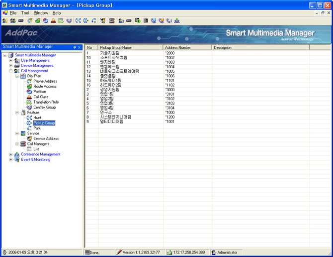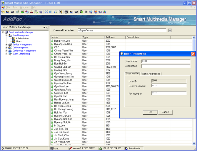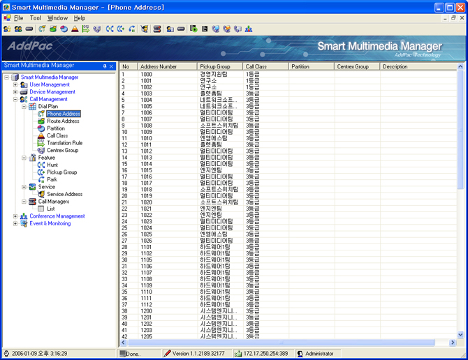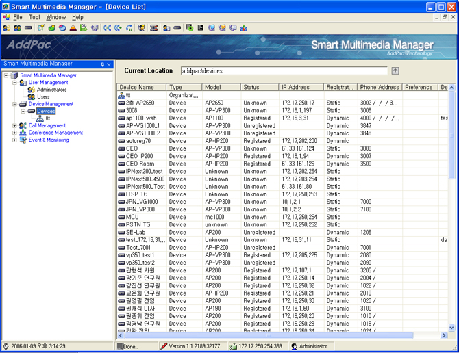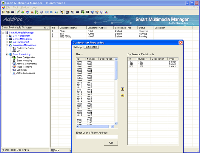 SMM (Smart Multimedia Manager) ´Â ¾ÖµåÆÅÅ×Å©³î·¯ÁöÀÇ Â÷¼¼´ë ¸ÖƼ¹Ìµð¾î ÅÚ·¹Æ÷´Ï ¼Ö·ç¼Ç¿¡¼ IP-PBX (SIP ¼¹ö ±â´É Æ÷ÇÔ), MCU ÀåºñµéÀ» À§ÇÑ °ü¸® ¼ÒÇÁÆ®¿þ¾î ÀÔ´Ï´Ù. SMM Àº MS Window ±â¹ÝÀÇ PC Ç÷§Æ÷¿È Ⱥ°æ¿¡¼ IP-PBXÀÇ »ç¿ëÀÚ °ü¸®, µð¹ÙÀ̽º °ü¸®, ´Ù¾çÇÑ È£ °ü¸®±â´É(Call Management), ȸÀÇ °ü¸® ±â´É(ȸÀÇ °ü¸®±â´É), Event & Trace ¸ð´ÏÅ͸µ, °·ÂÇÑ µð¹ö±ë ±â´ÉÀ» Áö¿øÇÏ´Â ¼ÒÇÁÆ®¿þ¾î ÀÔ´Ï´Ù. »ç¿ëÀÚ ¹× ±×·ì °ü¸® ±â´É (User Management)