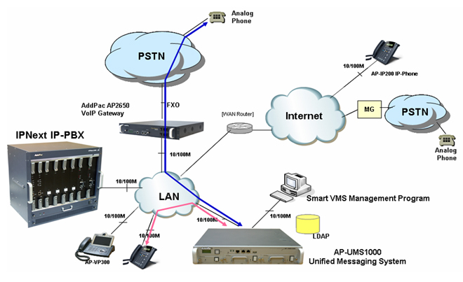 Overall Features Embedded system based on high performance RISC CPU Unified Messaging Service such as Voice Mailing, Video Mailing, etc Supports two (2) Gigabit Ethernet interfaces. Optional Voice Transcoding (G.711, G.726, G.729, G.723.1) Module Supports redundancy of 3.5-inch IDE hard disk (RAID1). Two(2) IDE-type hard disk slot modules LCD panel and blue lamp for checking the device Supports the USB 2.0 host interface. ¡¡ (Enables the USB DVD writer for backup in the secondary storage device.) SIP VoIP Signaling Support Inter-working with AddPac IP Telephony solution (IP-PBX, IP/Video Phones, VoIP gateway Smart IVR Scenario Editor Smart Multimedia Manager for AP-UMS Management ¡¡ - Session Monitoring - UMS System Monitor - MailBox Management Quota management for Each User MailBox Message Recording ( IP phone, IP video phone) Message Retrieving (IP Phone, IP Video Phone) Video Messaging E-Mail Notification ¡¡ - Media File Attach (Window Media Player) Network Features Multilevel QoS Support including AddPac Specialized QoS Algorithm High-performance IP-Routing Capability with Reliability Static and IEEE 802.1Q VLAN Routing Protocols including VRRP Traffic Queuing, and SNMP MIB v2 for Network Management Features Standard & Extended Access List for Security Functions Essential Scalability Features such as DHCP Server & Relay, NAT/PAT, IEEE Transparent Bridging, IP Accounting, and Debugging/Diagnostics, etc. DNSProxy, MAC Address Filter Service