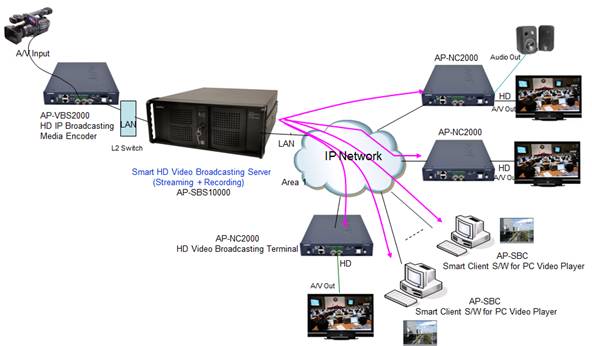 ¾ÖµåÆÅÅ×Å©³î·¯ÁöÀǽǽð£ HD IP ¿ø°Ý°ÀǼַç¼ÇÀº HD ¹æ¼Û¹Ìµð¾î¼¹ö, HD ¹æ¼Û¼¹ö ¿Í AP-NC2000 HD¹æ¼ÛÅ͹̳Î, ±×¸®°í AP-MBMS ¹æ¼Û°ü¸®¼ÒÇÁÆ®¿þ¾î·Î±¸¼ºµÇ¾îÀÖ½À´Ï´Ù. HD ¹æ¼Û¹Ìµð¾î¼¹ö´Â½Ç½Ã°£À¸·Î HD ¿µ»óÀ»°í¼º´Éºñµð¿À DSP ¿Í ÇÁ·Î¼¼¼¸¦»ç¿ëÇÏ¿©ÀÎÄÚµù ¹× ³×Æ®¿öÅ©·ÎÀü¼ÛÇÏ´ÂÀåºñÀÔ´Ï´Ù. AP-VBS2000, AP-VBS3000Á¦Ç°µéÀº HD ¹æ¼Û¹Ìµð¾î¼¹öÀÔ´Ï´Ù. ½Ì±Ûä³ÎÀåºñºÎÅ͵Îä³Î±îÁö ÇÑ Àåºñ¿¡¼Ã³¸® ÇÒ ¼ö ÀÖ½À´Ï´Ù.HD ¹æ¼Û ¹Ìµð¾î ¼¹ö¸¦ »ç¿ëÇÏ¿© ÀÎÄÚµùµÈ ¿µ»óÀº QoS¾Ë°í¸®ÁòÀ»»ç¿ëÇÏ¿© IP ³×Æ®¿öÅ©À¸·ÎÀü´ÞµÇ¸ç 1080i Ç® HD, HD (1280 x 720) ºñµð¿À¿µ»óÀ»ÃÊ´ç 30ÇÁ·¹ÀÓÀ¸·Î ¾ÐÃàÇϸçÀü¼Û´ë¿ªÆøÀº ~15Mbps Á¤µµ·Î°¡´ÉÇÕ´Ï´Ù. »ç¿ëÀÚ´Â³×Æ®¿öÅ©»óȲ¿¡µû¶ó¼ÀûÀýÇѺñÆ®·¹ÀÌÆ®¸¦¼³Á¤ÇÒ ¼ö ÀÖ½À´Ï´Ù. ¾ÖµåÆÅHD¹æ¼Û¼¹ö´Â³×Æ®¿öÅ©±â¹ÝÀÇ IP ¹æ¼Û½Ã½ºÅÛ±¸Á¶¿¡¼ RTSP ±â¹ÝÀ¸·Î¹æ¼Û¹Ìµð¾î¼¹ö·ÎºÎÅ;ÐÃàµÈ H.264ºñµð¿À ºñÆ®½ºÆ®¸²À»¼ö½ÅÇÏ¿©½Ç½Ã°£À¸·Î´Ùä³Î¹æ¼ÛÇϴ±â´ÉÀ»Á¦°øÇÕ´Ï´Ù. ¶ÇÇѵ¿½Ã¿¡ Video On Demand ¼ºñ½º¸¦À§ÇÏ¿©Çϵåµð½ºÅ©¿¡ºñµð¿À³ìȱâ´ÉÀ»Á¦°øÇÏ¿©»ç¿ëÀڿ䱸½Ã¿¡ÆÛ½º³Î PC ¿¡¼¹æ¼Û³ìÈÆÄÀÏÀ»Àç»ýÇϴ±â´ÉÀ»¼öÇàÇÕ´Ï´Ù. 4°³ÀÇ SATA Çϵåµð½ºÅ©¸¦ÀåÂøÇÒ ¼ö ÀÖÀ¸¸ç, 2 Tera Çϵåµð½ºÅ©¸¦ »ç¿ëÇÏ´Â °æ¿ì´Â ÃÖ´ë 8Tera ÀúÀå¿ë·®À» Áö¿øÇÒ ¼ö ÀÖ½À´Ï´Ù. HD ±Þ ¹× SD ±Þ ¿µ»óÀ» µ¿½Ã Á¦°øÇÒ ¼ö ÀÖµµ·Ï ¼³°èµÇ¾î Ãʱ⿡ Àü¼Û´ë¿ªÆøÀÌ ÀÛÀº °æ¿ì¿¡´Â SD ±ÞÀ¸·Î »ç¿ëÇÏ´Ù°¡ HD ±ÞÀ¸·Î »ç¿ëÇÒ ¼ö ÀÖ½À´Ï´Ù. ¸®´ª½º ±â¹ÝÀÇ Ç÷¿ÆûÀ» »ç¿ëÇÏ¸ç ¾ÈÁ¤¼ºÀ» ³ô¿´½À´Ï´Ù. ¾ÖµåÆÅÅ×Å©³î·¯ÁöÀÇ Full HD ±Þ IP ºñµð¿À ¹æ¼Û Å͹̳ÎÀº AP-NC2000 Çϵå¿þ¾îÇ÷¿Æ÷¿È¿¡ Ç® HD/HDºñµð¿À¹æ¼Û µðÄÚ´õ ¸ðµâ·Î ±¸¼ºµÇ¾î ÀÖ½À´Ï´Ù ÃÖ½ÅÀÇ H.264 ºñµð¿ÀÄÚµ¦À»»ç¿ëÇϸç HD-SDI, HDMI, Analog CVBSÀÔ·Â/Ãâ·ÂÀ»Á¦°øÇÕ´Ï´Ù. ¾ÖµåÆÅIPºñµð¿À¹æ¼ÛÀü¼ÛÀåÄ¡´Â¾ÖµåÆÅÀÌÁ÷Á¢¼³°è ? °³¹ßÇÑ°í¼º´É DSP Çϵå¿þ¾î¿Í°í¼º´ÉÇÁ·Î¼¼¼¸¦°áÇÕÇØ Ç® HD°íǰÁú¿µ»óÀ»½Ç½Ã°£À¸·Î µðÄÚµùÇÒ ¼ö ÀÖ½À´Ï´Ù. ¾ÖµåÆÅ HD IP ¿ø°Ý°ÀÇ ¼Ö·ç¼ÇÀº ICMP ¸ÖƼij½ºÆ® ÇÁ·ÎÅäÄÝ, QoS(Quality of Service), ·Îµå ºÐ»êÀ» À§ÇÑ VRRP (Virtual Router Redundancy Protocol) µéÀ» Áö¿øÇÕ´Ï´Ù. ÀÌ·¯ÇÑ ±â´ÉµéÀº ´Ù¾çÇÑ Å¸ÀÔÀÇ À̽´µéÀ» ÇØ°áÇϴµ¥ Áß¿äÇÑ ±â´ÉÀ» ¼öÇàÇÕ´Ï´Ù. ¾ÖµåÆÅÀÇ ´Ù¾çÇÑ ºñµð¿À Á¦Ç°±º ¹× ¼Ö·ç¼ÇµéÀº Çѱ¹Àº ¹°·Ð, ¼¼°è ½ÃÀå¿¡¼ ±× ¼º´É°ú ¾ÈÁ¤¼ºÀ» ÀÎÁ¤¹Þ°í ÀÖ½À´Ï´Ù. ¾ÖµåÆÅÀÌ ±×µ¿¾È ¿£ÅÍÇÁ¶óÀÌÁî ½ÃÀå°ú Åë½Å »ç¾÷ÀÚ ½ÃÀå¿¡¼ ½×Àº °æÇè°ú ³ëÇϿ찡 ½º¸çµé¾î ÀÖ´Â ±â¾÷¿ë °íǰÁú IP ¿ø°Ý°ÀǼַç¼ÇÀº ³×Æ®¿öÅ© ±â¹ÝÀÇ Â÷¼¼´ë ¿ø°Ý°ÀÇ ¼Ö·ç¼ÇÀ» ¿ä±¸ÇÏ´Â °í°´¿¡°Ô ³ôÀº ¸¸Á·À» µå¸± °ÍÀÔ´Ï´Ù