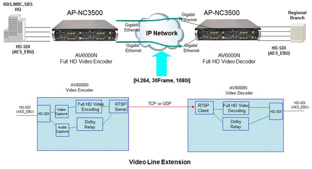 ±¤Åë½Å±â¼úÀ» »ç¿ëÇÑ IP³×Æ®¿öÅ©ÀÇ ±¤´ë¿ªÈ(BcN; Broadband convergence Network)¿¡ µû¶ó VoIP(Voice over IP) À½¼º µ¥ÀÌÅÍ ÅëÇÕ ¹°°áÀ» ³Ñ¾î °íǰÁú ¿µ»óÅë½ÅÀÇ ¼¼»óÀÌ º»°ÝÀûÀ¸·Î ÆîÃÄÁö°í ÀÖ½À´Ï´Ù. ±×µ¿¾È SD ±Þ ¿µ»óÀü¼Û ½Ã½ºÅÛ¿¡ ¸Ó¹°°í ÀÖ¾ú´Ù¸é, ÀÌÁ¦ Full HD¿µ»óºÐ¾ß·Î °í°³¸¦ µ¹¸®½Ê½Ã¿À. ¸ÖƼ¹Ìµð¾î¿Í µ¥ÀÌÅÍ Åë½Å ÅëÇÕÀÇ ¼±µÎÁÖÀÚ ¾ÖµåÆÅÀÌ Full HD ¿µ»ó Àü¼Û ÄÚµ¦ÀÇ »õ·Î¿î ºñÀüÀ» Á¦½ÃÇÕ´Ï´Ù. ¾ÖµåÆÅÀÇ IP ±â¹Ý Full HDºñµð¿ÀÀü¼Û ¼Ö·ç¼ÇÀº °íÈÁúÀÇFull HD¿µ»ó ¹× À½¼º¹æ¼ÛÀ» ½Ç½Ã°£ ¼ÛÃâÇÏ´Â Â÷¼¼´ë Full HD ¹æ¼Û Àü¼Û ¼¹ö ¼Ö·ç¼ÇÀÔ´Ï´Ù. AP-NC2000 ½Ã½ºÅÛÀºIP ±â¹ÝÀÇFull HD ºñµð¿À ¹æ¼Û ¹Ìµð¾î Àü¼Û Àåºñ·Î 1°³ÀÇ AV6000N Ç® HD ºñµð¿À ¹æ¼Û ÀÎÄÚ´õ/µðÄÚ´õ ¸ðµâÀ» žÀçÇÒ ¼ö ÀÖ½À´Ï´Ù. HD-SDI±â¹ÝÀÇ Ç® HD µðÁöÅÐ ¿µ»ó ¹× AES-EBU ±Ô°ÝÀÇ °íǰÁú Dolby ¿Àµð¿À ½ÅÈ£¸¦ ÀÔ·ÂÀ¸·Î ¼ö½ÅÇÏ¿© H.264 µ¿¿µ»ó ¾ÐÃà ¹× Dolby Pass-Thru ±â´ÉÀ» ¼öÇàÇÒ ¼ö ÀÖ½À´Ï´Ù. ¹æ¼Û±¹µî ´Ù¾çÇÑ ÀÀ¿ëºÐ¾ß¿¡¼ IP ±â¹ÝÀÇ ½Ç½Ã°£ Ç®HD ±Þ ¿µ»ó ¹æ¼Û Àü¼Û ºÐ¾ß¿¡ Àû¿ëÇÒ ¼ö ÀÖ½À´Ï´Ù. ÀÓº£µðµå Çϵå¿þ¾î ŸÀÔÀÇ Full HD °í¼º´É ºñµð¿À ¹æ¼Û Àü¼ÛÀåÄ¡ ¾ÖµåÆÅÅ×Å©³î·¯ÁöÀÇ Full HD ±Þ IP ºñµð¿À ¹æ¼Û Àü¼Û ¼Ö·ç¼ÇÀº AP-NC2000 Çϵå¿þ¾î Ç÷¿Æ÷¿È¿¡ AV35000 Ç® HD ºñµð¿À ¹æ¼Û ÀÎÄÚ´õ/µðÄÚ´õ ¸ðµâ·Î ±¸¼ºµÇ¾î ÀÖ½À´Ï´Ù ÃÖ½ÅÀÇ H.264 ºñµð¿À ÄÚµ¦À» »ç¿ëÇϸç HD-SDI, HDMI, Analog CVBSÀÔ·Â/Ãâ·ÂÀ» Á¦°øÇÕ´Ï´Ù. ¾ÖµåÆÅ IPºñµð¿À ¹æ¼Û Àü¼Û ÀåÄ¡´Â ¾ÖµåÆÅÀÌ Á÷Á¢ ¼³°è ? °³¹ßÇÑ °í¼º´É DSP Çϵå¿þ¾î¿Í °í¼º´É ÇÁ·Î¼¼¼¸¦ °áÇÕÇØ Ç® HD°íǰÁú ¿µ»óÀ» ½Ç½Ã°£À¸·Î ÀÎÄÚµù/µðÄÚµù?Àü¼ÛÇÒ ¼ö ÀÖ½À´Ï´Ù. AES-EBU ±Ô°ÝÀÇ °íǰÁú ¿Àµð¿À Àü¼ÛÁö¿ø AV6000N ¾ÖµåÆÅ Full HD ±Þ IP ºñµð¿À ¹æ¼Û Àü¼Û ÄÚµ¦Àº AES-EBU¿Àµð¿À ¹æ¼Û Àü´Þ Ç¥Áر԰ÝÀ» Áö¿øÇÒ ¼ö ÀÖµµ·Ï ¼³°èµÇ¾î ¹æ¼Û±¹¿¡¼ Áö¿ª ¹æ¼Û±¹À¸·Î HD-SDI ¶óÀÎÀ» ÅëÇÏ¿©Dolby °°Àº °íǰÁú ¿Àµð¿À ½ÅÈ£¸¦ Àü¼ÛÇÒ ¼ö ÀÖµµ·Ï ¼³°èµÇ¾ú½À´Ï´Ù. ¼Û½Å´Ü¿¡¼´Â HD-SDI µðÁöÅÐ ÀÎÅÍÆäÀ̽º¿¡ Embedded µÈ 4xAES Æä¾î ½ÅÈ£·Î Æ÷¸äµÈ Dobly ½ÅÈ£¸¦ ÃßÃâÇÏ¿© IP µ¥ÀÌÅÍ·Î ÀçÀü¼ÛÇÏ´Â ±â´ÉÀ» ¼öÇàÇϰí, ¼ö½Å´Ü¿¡¼´Â IP ·Î ÀÔ·ÂµÈ Dolby ½ÅÈ£¸¦ AES-EBU Ç¥Áر԰ÝÀ¸·Î HD-SDI ¶óÀο¡ ºñµð¿À ½ÅÈ£¿Í ÇÔ²² embedding ½ÃŰ´Â ±â´ÉÀ» ¼öÇàÇÑ´Ù. ½Ç½Ã°£ Full HD ¶óÀÌºê ¿µ»ó½Ã´ë °³¸· ¾ÖµåÆÅ Ç® HD±Þ IP ºñµð¿À ¹æ¼Û Àü¼ÛÀåÄ¡´Â ¶Ù¾î³ ¼º´É°ú ¾ÈÁ¤¼ºÀ» ±â¹ÝÀ¸·Î Áö±Ý±îÁöÀÇ ¿µ»ó ¼Ö·ç¼Ç¿¡¼ ²Þ²Ù±â ¾î·Á¿ü´ø °íǰÁúÀÇ ½Ç½Ã°£ ¿µ»óÀÇ ¼¼°è¸¦ ÆîÃÄÁÝ´Ï´Ù. AV6000N Çϵå¿þ¾î ÄÚµ¦ ¸ðµâÀº °í¼º´É RISC CPU+DSP ±â¹ÝÀÇ ÀÓº£µðµå ½Ã½ºÅÛÀ¸·Î ¼³°èµÅ °íǰÁú ¿µ»óÀ» ½Ç½Ã°£ Àü¼Û?Àç»ýÇÒ ¼ö Àִ ÷´Ü ÀåºñÀÔ´Ï´Ù. H.264À¸·Î ¾ÐÃàµÈ ¿µ»óÀº ¾ÖµåÆÅÀÇ Ã·´Ü QoS ¾Ë°í¸®ÁòÀ» ÅëÇØ µ¥ÀÌÅÍ ÅëÇÕ¸Á¿¡¼µµ ¾ÈÁ¤µÈ °íǰÁú ¿µ»óÀ» Áö¿øÇÕ´Ï´Ù. H.264¾ÐÃàÄÚµ¦ ±âÁØÀ¸·Î Full HD 1080i/1080P±Þ ¿µ»óÀ» ÃÊ´ç 30ÇÁ·¹ÀÓ±îÁö ó¸®ÇØ 4~20Mbps Àü¼Û ´ë¿ªÆøÀ¸·Î HDTV±Þ ¿µ»óÀ» IP ³×Æ®¿öÅ© ȯ°æ¿¡¼ ½ÇÇöÇß½À´Ï´Ù. ƯÈ÷ ³×Æ®¿öÅ© »óÅ¿¡ µû¶ó ÇÁ·¹ÀÓ ·¹ÀÌÆ®¿Í ÀûÀýÇÑ ºñÆ® ·¹ÀÌÆ®¸¦ ÁöÁ¤ÇÒ ¼ö ÀÖ¾î ³·Àº ´ë¿ªÆøÀÇ È¯°æ¿¡¼ºÎÅÍ ³ôÀº Àü¼Û ´ë¿ªÆøÀÇ ³×Æ®¿öÅ© ȯ°æ±îÁö Æø³Ð°Ô ¼ö¿ëÇÕ´Ï´Ù. ¸ðµç ±â´ÉÀ» ¿ø°Ý °ü¸® AV6000N°¡ ÀåÂøµÈ AP-NC2000 Ç®HD ºñµð¿À ÀåºñµéÀº µ¶¸³ÀûÀ¸·Î ¿î¿µµÇ¸ç, ÀåºñÀÇ ¾ÈÁ¤¼º È®º¸ Â÷¿ø¿¡¼ telnet À̳ª ftp µîÀ» ÅëÇØ ¿ø°Ý¿¡¼ ÀåºñÀÇ »óÅ Á¡°Ë°ú ±â´É¼³Á¤ ¹× ¼ÒÇÁÆ®¿þ¾î ¾÷±×·¹À̵尡 °¡´ÉÇÕ´Ï´Ù. ¶ÇÇÑ ¿©·¯ ÁöÁ¡¿¡¼ ¿©·¯ ´ëÀÇ AP-NC2000À» ¿î¿µÁßÀΠȯ°æÀ» À§ÇØ º°µµ GUI ±â¹ÝÀÇ °ü¸® ½Ã½ºÅÛÀ» Á¦°øÇÕ´Ï´Ù. AP-NC2000ÀÇ ÀÛµ¿ »óŸ¦ Á¡°ËÇϰí, ¿øÇÏ´Â ÁöÁ¡À¸·Î ºñµð¿À ¼ÛÃâÀÌ °¡´ÉÇÕ´Ï´Ù. Æß¿þ¾î ¾÷±×·¹ÀÌµå °¡´ÉÇÑ DSP ±â¹ÝÀÇ HW ÄÚµ¦ AV6000N Ç®HD ºñµð¿À ÄÚµ¦ ¸ðµâÀº ÃÖ½ÅÀÇ ¿µ»ó ÄÚµ¦ÀÎ H.264¸¦ ±â¹ÝÀ¸·Î ¿Àµð¿À/ºñµð¿À ÀÎÄÚµùÀ» µ¿½Ã¿¡ Áö¿øÇÕ´Ï´Ù. ±× Áß¿¡¼µµ ºñµð¿À ÄÚµ¦¿¡¼ »ç¿ëµÇ´Â DSP´Â ¸ðµÎ ÇÁ·Î±×·¡¸Óºí ±¸Á¶À̱⠶§¹®¿¡ Áö¼ÓÀûÀÎ ±â´É°³¼±À̳ª º¯°æ, Ãß°¡°¡ °¡´ÉÇÕ´Ï´Ù. ÇâÈÄ ±â¼ú º¯È¿¡ À¯¿¬ÇÏ°Ô ´ëóÇÒ ¼ö ÀÖÀ¾´Ï´Ù. ±â´ÉÃß°¡, º¯°æÀÌ ÀÖÀ» ¶§¸¶´Ù Á÷Á¢ ¾ÖµåÆÅ ȨÆäÀÌÁö¿¡¼ ´Ù¿î¹Þ°Å³ª ÀÚµ¿ ¾÷±×·¹ÀÌµå ¿É¼ÇÀ» ÁöÁ¤Çصθé, º°µµ ¼ö°í¸¦ ÇÒ ÇÊ¿ä ¾øÀÌ ÃÖ½ÅÀÇ ±â´ÉÀ» ÀÌ¿ëÇÒ ¼ö ÀÖ½À´Ï´Ù.