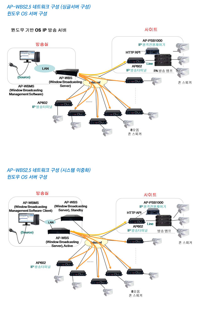 AP-WBS 2.5 (Window based IP Broadcasting Server) ´Â ¾ÖµåÆÅÅ×Å©³î·¯ÁöÀÇ Â÷¼¼´ë IP ±â¹Ý À½¼º ¹æ¼Û ¼Ö·ç¼Ç¿¡¼ Fault Tolerant ¹æ¼Û ¼Ö·ç¼ÇÀ» À§ÇÑ MS-Window¿ë IP ¹æ¼Û¼¹ö, AP-WBMS ¹æ¼Û °ü¸® ¼ÒÇÁÆ®¿þ¾î ºÐ¸®Çü Á¦Ç°ÀÔ´Ï´Ù. AP-WBMS ¹æ¼Û °ü¸® ¼ÒÇÁÆ®¿þ¾î´Â MS Window ±â¹ÝÀÇ PC Ç÷§Æ÷¿È ȯ°æ¿¡¼ ¼¹ö/Ŭ¶óÀÌ¾ðÆ® ±¸Á¶¸¦ ¼³°èµÇ¾úÀ¸¸ç ±×·ì ¹æ¼Û ¹× °³º°¹æ¼ÛÀ» À§ÇÑ ¹æ¼Û ±â´É, »ç¿ëÀÚ µî·Ï ¹× Á¢±Ù Á¦ÇÑ °ü¸®, ¾ÖµåÆÅ À½¼º ¹æ¼Û Å͹̳ΠÀåºñ°ü¸®, ¹æ¼Û¼Ò½º ¹× ¹æ¼Û±×·ì °ü¸®, Áñ°Üã±â °ü¸®, ¿¹¾à¹æ¼Û ¹× ½Ãº¸ ¹æ¼Û, TTS(Text to Speech) ¹æ¼Û, ¹Ýº¹¹æ¼Û, ¿ø°Ý ¹æ¼Û°ü¸®, ¹æ¼ÛÅ͹̳ΠÀåºñÁ¡°Ë, À̺¥Æ® ÀÌ·Â Á¶È¸ ±â´ÉµéÀ» Áö¿øÇÏ´Â ¼ÒÇÁÆ®¿þ¾î ÀÔ´Ï´Ù. À̹ø¿¡ »õ·Ó°Ô Ãâ½ÃµÈ ¾÷±×·¹ÀÌµÈ AP-WBS 2.5 ¹öÁ¯Àº ±âÁ¸ÀÇ AP-WBS ¹öÀü±â´É¿¡ Ãß°¡ÀûÀ¸·Î »ç¼³ IP ¸Á¿¡¼ÀÇ ¹æ¼ÛÅ͹̳Π¿î¿µ±â´É, À½¼º±Þ VoIP ÄÚµ¦¿Ü¿¡ Ãß°¡ÀûÀ¸·Î °íǰÁú ¿Àµð¿À±Þ ¹æ¼ÛÄÚµ¦ ±â´É (OPUS, Vorbis Decoder µî)Áö¿ø, ¹æ¼ÛÀÌ Á¦´ë·Î Àß³ª°¡°í ÀÖ´ÂÁö üũÇÏ´Â ¹æ¼Û ¸ð´ÏÅ͸µ ±â´É(¹æ¼Û´Ü¸»±â¿¡ 3.5mm ¸¶ÀÌÅ©¿¬°á), ±âÁ¸ÀÇ RTP ÇÁ·ÎÅäÄÝ ¿Ü¿¡ Ãß°¡ÀûÀ¸·Î RTSP ÇÁ·ÎÅä·Ñ ±â¹ÝÀÇ ¹æ¼Û Àü¼Û ÇÁ·ÎÅäÄݵµ Áö¿ø Çϵµ·Ï ¼³°è µÇ¾ú½À´Ï´Ù. WBS2.5 ¿¡¼ Áö¿øÇÏ´Â ¿Àµð¿À±Þ ¹æ¼Û ÄÚµ¦Àº Â÷¼¼´ë ¿Àµð¿À±Þ ¹æ¼ÛÅ͹̳ΠAP605 ¿Í ÇÔ²² »ç¿ëµÉ¼ö ÀÖ½À´Ï´Ù. RTSP Àü¼Û ÇÁ·ÎÅäÄÝÀº ¼¹ö ¾Ø Ŭ¶óÀÌ¾ðÆ® Àü¼Û ÇÁ·ÎÅäÄÝ ±¸Á¶·Î ¼³°èµÇ¾î, »ç¼³IP ȯ°æ¿¡¼ º°µµÀÇ ÅͳθµÇÁ·ÎÅäÄÝ(PPTP,L2TP) ÀÌ ¾ø¾îµµ IP ¹æ¼ÛÀ» ¼öÇàÇÒ¼ö ÀÖ½À´Ï´Ù. ¶ÇÇÑ À̹ø¿¡ °³¹ßµÈ AP-WBS2.5 À©µµ¿ì±â¹Ý Â÷¼¼´ë IP ¹æ¼Û¼Ö·ç¼ÇÀº ½Ì±Û IP ¹æ¼Û¼¹ö ±â´É»Ó¸¸¾Æ´Ï¶ó, Áߴܾø´Â ¹æ¼Û¼ºñ½º¸¦ À§Çؼ ¹æ¼Û¼¹ö ÀÌÁßÈ ±â´Éµµ Áö¿øÇÒ¼ö ÀÖµµ·Ï ¼³°èµÇ¾î ÀÖ½À´Ï´Ù. ¾ÈÁ¤¼ºÀÌ ³ôÀº °ü±¤¼³ª, ±º°æ µî Á߿䵿º¸¹æ¼Û ½Ã¼³ÀÌ ÀÖ´ÂÀå¼Ò¿¡¼ »ç¿ëµÉ¼ö ÀÖ½À´Ï´Ù. AP-WBS2.5 ¹æ¼Û¼ÒÇÁÆ®¿þ¾î ÁÖ¿äÆ¯Â¡ - À©µµ¿ì ±â¹Ý ¹æ¼Û ¼¹ö ¹× ¹æ¼Û ¿î¿µ °ü¸® ¼ÒÇÁÆ®¿þ¾î - À©µµ¿ì±â¹Ý IP ¹æ¼Û¼¹ö + ¹æ¼Û°ü¸® ¼ÒÇÁÆ®¿þ¾î ºÐ¸®Çü - À©µµ¿ì±â¹Ý IP ¹æ¼Û¼¹ö ÀÌÁßÈ ±â´É (Active, Standby) - »ç¼³ IP ¸Á ¹æ¼Û Áö¿ø - À½¼º±Þ VoIP ÄÚµ¦ Áö¿ø ¹× ¿É¼ÇÀ¸·Î °íǰÁú ¿Àµð¿À±Þ ¹æ¼Û´Ü¸»±â »ç¿ë½Ã ¿Àµð¿À±Þ ¹æ¼ÛÄÚµ¦ ±â´ÉÁö¿ø (OPUS, Vorbis Decoder) - ¿ø°Ý¹æ¼Û ½Ç½Ã°£ ¸ð´ÏÅ͸µ ±â´É (¹æ¼Û´Ü¸»±â¿¡ 3.5mm ¸¶ÀÌÅ© ¿¬°á), ¹æ¼Û»óÅ Áø´Ü±â´É - RTP ½Ç½Ã°£ ÇÁ·ÎÅäÄÝ Áö¿ø - RTSP ½ºÆ®¸®¹Ö ÇÁ·ÎÅäÄÝ Áö¿ø - »ç¿ëÀÚ °ü¸® ¹× Á¢±Ù Á¦¾î - ¹æ¼Û ¼Ò½º, ¹æ¼Û ±×·ì, ºü¸¥ ¹æ¼Û(ÀÚÁÖ¾²´Â¹æ¼Û) °ü¸® ±â´É - ¿¹¾à ¹× ½ºÄÉÁÙ ¹æ¼Û - TTS (Text to Speech) ¹æ¼Û ±â´É - ¹Ýº¹ ¹æ¼Û ±â´É - IP ¹æ¼Û Å͹̳Π»óÅ üũ ±â´É ¿Ü. - À̺¥Æ® ·Î±× ±â´É - ¹Ìµð¾î ÆÄÀÏ ¹æ¼Û AP-WBS2.5 ³×Æ®¿öÅ© ±¸¼º (½Ì±Û¼¹ö ±¸¼º) À©µµ¿ì OS ¼¹ö ±¸¼º AP-WBS2.5 ³×Æ®¿öÅ© ±¸¼º ( ½Ã½ºÅÛ ÀÌÁßÈ) À©µµ¿ì OS ¼¹ö ±¸¼º 120 ¿ÍÆ®±Þ ¿ÜºÎ PA ¾ÚÇÁ ¿¬°á±¸¼ºµµ