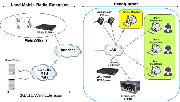 ¾ÖµåÆÅ ½º¸¶Æ® RoIP (Radio over IP) µð½ºÆÐÃÄ(dispatcher)´Â Áß´ëÇü ±Ô¸ðÀÇ RoIP ¸Á¿¡¼ LMR(Land to Mobile) °ÔÀÌÆ®¿þÀÌ, PTT (Push to Talk) ½º¸¶Æ®Æù, PTT IP Àüȱâµî ´Ù¾çÇÑ PTT ±×·ìÀ» ¿¬°á, Á¦¾î, °ü¸®ÇÏ´Â À©µµ¿ì ±â¹ÝÀÇ ¼ÒÇÁÆ®¿þ¾î ÀÔ´Ï´Ù. Æí¸®ÇÑ »ç¿ëÀÚ ÀÎÅÍÆäÀ̽º(GUI: Graphic User Interface) ÅëÇØ PTT±×·ì°£ÀÇ ¿¬°á ¼ºñ½º µîÀ» ÃÖÀûÀ¸·Î Áö¿øÇÕ´Ï´Ù. ÀÌÁ¦ RoIP ¼Ö·ç¼ÇÀÇ ¼±Åà ±âÁØÀº Æí¸®¼º°ú ½º¸¶Æ® RoIP µð½ºÆÐÃÄ °°Àº ÅäÅÐ ¼Ö·ç¼ÇÀÔ´Ï´Ù. ¹«Àü±â¸Á ¿¬µ¿ ±×·ìÄÝ (PTT over IP) ÅäÅÐ ¼Ö·ç¼Ç ¾ÖµåÆÅÅ×Å©³î·¯ÁöÀÇ PTT over IP ¼Ö·ç¼ÇÀº ±âÁ¸ ¹«Àü±â¸Á ¿¬µ¿µî ´Ù¾çÇÑ À¯¹«¼± ³×Æ®¿öÅ© ȯ°æ¿¡¼ »ç¿ëµÉ ¼ö ÀÖ´Â PTT ±×·ìÄÝ ¼ºñ½º ÅäÅÐ ¼Ö·ç¼ÇÀÔ´Ï´Ù. ¾ÖµåÆÅ ±×·ìÄÝ ¼Ö·ç¼ÇÀº Â÷¼¼´ë IP-PBX ÀÎ IPNext3000, AP-PTS3000 PTT ¼¹ö, ¹«Àü±â ¿¬µ¿ LMR(Land-to-Mobile Radio) °ÔÀÌÆ®¿þÀÌ, ¾Èµå·ÎÀÌµå ±â¹ÝÀÇ ½º¸¶Æ®Æù SIP PTT ¾îÇÃ, PTT IP Àüȱâ, WSMM(Web based Smart Multimedia Manager), Smart RoIP Dispatcher, ¸Á°ü¸® ½Ã½ºÅÛ NMS(Network Management System) µîÀ¸·Î ±¸¼ºµÇ¾î ÀÖ½À´Ï´Ù. ¾ÖµåÆÅÀÇ ±×·ìÄÝ ¼Ö·ç¼ÇÀº IP ±â¹ÝÀ¸·Î ¼³°èµÇ¾î À¯¹«¼± ÅëÇÕ ¹× À§¼ºÅë½Å ÀÀ¿ëÀÌ °¡´ÉÇϸç, Àå¼Ò¿¡ »ó°ü¾øÀÌ ÀÏ´ëÀÏ ¹× ±×·ìÄÝ ¼ºñ½º¸¦ Á¦°øÇÒ ¼ö ÀÖÀ¸¸ç VoIP ±â¼úÀ» »ç¿ëÇϱ⠶§¹®¿¡ Åë½Å¿ä±ÝÀ» Àý¾àÇÒ ¼ö ÀÖ´Ù. ¶ÇÇÑ ¹«Àü±â¸Á ¿¬µ¿ ±â´ÉÀ» Á¦°øÇÏ¿© ±âÁ¸ÀÇ ¹«Àü±â¸ÁÀÇ ¼³ºñ ¹× ÀåÁ¡À» ±×´ë·Î À¯Áö ÇÒ ¼ö ÀÖ´Â°Ô ÀåÁ¡ÀÌ´Ù. 3G ½º¸¶Æ®Æù ¾îÇÃÀ» »ç¿ëÇÏ¿© ¹«Àü±â¸ÁÀÇ Ä¿¹ö¸®Áö¸¦ Àü±¹¸ÁÀÎ 3G ¸ÁÀ¸·Î È®ÀåÇÏ¿© ±×·ìÄÝ ¼ºñ½º¸¦ Á¦°øÇÒ ¼ö ÀÖ½À´Ï´Ù. È®À强ÀÌ ¶Ù¾î³ª¼ IP-PBX ÀÇ °¡ÀÔÀÚ ¿ë·®°ú PTT ¼¹öÀÇ ´ë¼ö¸¦ ´Ã¸®¸é À¯¹«¼± PTT ¼ºñ½º °¡ÀÔÀÚ¸¦ ´Ã¸± ¼ö ÀÖµµ·Ï ¼³°èµÇ¾ú½À´Ï´Ù.. ƯÈ÷ ¾Èµå·ÎÀÌµå ½º¸¶Æ®Æù ¾îÇÃÀº 3G(mVoIP), WiFi µà¾ó¸ðµå¸¦ Áö¿øÇÒ ¼ö ÀÖ°í, ¾ÖµåÆÅÀÇ VoIP Á¦Ç°±º¿¡¼ ¿À·£¼¼¿ù °ËÁõµÈ SIP Ç¥ÁؽÅÈ£ ü°è¸¦ »ç¿ëÇϱ⠶§¹®¿¡ ȣȯ¼º ¹× È®À强ÀÌ ¶Ù¾î³³´Ï´Ù. Áß´ëÇü RoIP ¸Á ¼ºñ½º¸¦ À§ÇÑ Smart RoIP Dispatcher ¼ÒÇÁÆ®¿þ¾î