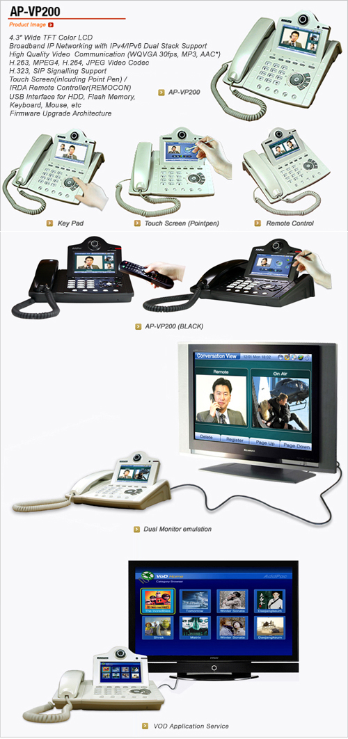 AP-VP200 ºñµð¿ÀÀüȱâ´Â ±× µ¿¾È VoIP ºÐ¾ß¿¡¼ ÃàÀûÇØ¿Â À½¼ºÃ³¸® ±â¼ú¿¡ ÷´Ü ºñµð¿À ±â¼úÀ» Ãß°¡ÇÑ °í¼º´É ´Ù±â´É IP ¿µ»óÀüȱâÀÔ´Ï´Ù. ¡°4.3 ÀÎÄ¡ ¿ÍÀÌµå °íÇØ»óµµÀÇ LCD¸¦ äÅÃÇØ ¸¼°í ¼±¸íÇÑ ¿µ»óÀ» Áö¿øÇϰí, ¿ÜºÎ ¸ð´ÏÅÍ¿Í ¿¬°áÇØ ´ëÇü ȸéÀÇ ¿µ»óÀ» Áñ±æ ¼ö ÀÖ´Â ½Ã½ºÅÛÀ̱⠶§¹®ÀÔ´Ï´Ù. ½Ã½ºÅÛ Á¦¾î ¹× °ü¸®ÀÇ Æí¸®¼ºÀ» À§Çؼ OSD(On Screen Display) ¸¦ Áö¿øÇϸç, ÅÍÄ¡½ºÅ©¸°(Æ÷ÀÎÆ® Ææ Áö¿ø), ¸®¸ðÄÁ, ¸Þ´º ۸¦ ÅëÇØ¼ Àåºñ ¼³Á¤ ¹× Á¦¾î°¡ °¡´ÉÇÕ´Ï´Ù. ¸®¸ðÄÁ ±â´ÉÀº AP-VP200 ¿¡¼ VoD ¼ºñ½º³ª IPTV ¼ºñ½º¸¦ »ç¿ëÇÒ ¶§ Æí¸®ÇÏ°Ô »ç¿ëÇÒ ¼ö ÀÖ½À´Ï´Ù. AP-VP200 Àº 64Kbps~¼öMbps ±ÞÀÇ ³×Æ®¿öÅ©±îÁö Áö¿øÇϱ⠶§¹®¿¡ ÀÎÅͳÝÀ¸·Î ¿¬°áµÈ °÷À̶ó¸é ¾îµð¼³ª »ç¿ëÇÒ ¼ö ÀÖ½À´Ï´Ù. ƯÈ÷ Á¦ÇÑµÈ ´ë¿ªÆø »óȲ¿¡¼ ÃÖÀûÀÇ ÈÁú°ú ÇÁ·¹ÀÓ ·¹ÀÌÆ® º¸ÀåÀ» À§ÇÑ ¡®Rate Control¡¯ ±â´É°ú ÀÎÅͳݻóÀÇ ´Ù¾çÇÑ ÆÐŶ ¿À·ù¿¡ ´ëÀÀ Çϱâ À§ÇÑ ÇÏÀÌ¿£µå Error Resilience ±â¼úÀ» Àû¿ëÇØ ÃÖÀûÀÇ ÈÁúÀ» º¸ÀåÇÕ´Ï´Ù. MPEG-4 ¾ÐÃà ÄÚµ¦ ±âÁØÀ¸·Î VGA(640x480) ±Þ ¿µ»óÀ» ÃÊ´ç 30ÇÁ·¹ÀÓ±îÁö ó¸®ÇÒ ¼ö ÀÖ½À´Ï´Ù.