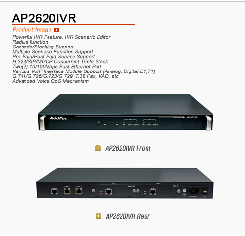 ¾ÖµåÆÅ AP2620IVR VoIP Àåºñ´Â VoIP °ÔÀÌÆ®¿þÀÌ ¼ºñ½º ±â´É¿¡¼ IVR ±â´ÉÀ» ´ëÆø °È½ÃŲ VoIP °ÔÀÌÆ®¿þÀÌ ÀåºñÀÔ´Ï´Ù. MS-Window »ó¿¡¼ ¿î¿µµÇ´Â VXML ±â¹ÝÀÇ ½Ã³ª¸®¿À ¿¡µðÅÍ ÇÁ·Î±×·¥À» »ç¿ëÇÏ¿© »ç¿ëÀÚ°¡ ¿øÇÏ´Â IVR ȯ°æÀ» Á÷Á¢ ±¸¼ºÇÒ ¼ö ÀÖ½À´Ï´Ù. ¶ÇÇÑ VoIP °ÔÀÌÆ®¿þÀÌ¿¡¼ Pre-Paid/Post-Paid ¼ºñ½º¸¦ À§ÇÑ ÄÝ ½Ã³ª¸®¿À¸¦ ±âº»ÀûÀ¸·Î Á¦°øÇÕ´Ï´Ù. ´Ù±¹¾îÁö¿ø°ú RADIUS ÀÎÅÍÆäÀ̽º¸¦ Áö¿øÇÕ´Ï´Ù. ¶ÇÇÑ ÇϳªÀÇ IP ¾îµå·¹½º¸¦ »ç¿ëÇÏ¿© AP2620IVR Àåºñ¸¦ ij½ºÄÉÀ̵ù ÇÒ ¼ö ÀÖ´Â ½ºÅÃÅ· ±â´ÉÀ» Áö¿øÇÕ´Ï´Ù