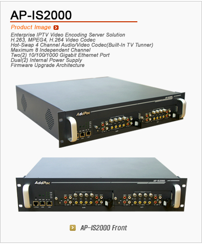 AP-IS2000 ÀÓº£µðµå IPTV ºñµð¿À ÀÎÄÚµù (Video Encoding)¼¹ö´Â Â÷¼¼´ë °í¼º´É ³×Æ®¿öÅ© ±â¹ÝÀÇ µðÁöÅÐ ºñµð¿À ÀÎÄÚµù Àåºñ·Î ¶óÀÌºê ¿µ»ó¿¡ ´ëÇÑ IPTV ¼ºñ½º¸¦ Á¦°øÇÒ ¼ö ÀÖÀ¸¸ç, 2Æ÷Æ®ÀÇ 10/100/1000Mbps ±â°¡ ºñÆ® ÀÎÅÍÆäÀ̽º¿Í µÎ°³ÀÇ Hot-Swap ºñµð¿À ¸ðµâ ½½·ÔÀ¸·Î ±¸¼ºµÇ¾î ÀÖ´Â IPTV ºñµð¿À ÀÎÄÚµù ¼¹ö Àåºñ ÀÔ´Ï´Ù. ¸ÖƼä³Î A/V ÀÎÄÚ´õ, ´Ùä³Î ¿µ»ó ¹æ¼Û ¼¹ö, ±â¾÷¿ë IPTV ÀÎÄÚ´õ µî ´Ù¾çÇÑ ¸ÖƼ¹Ìµð¾î ³×Æ®¿öÅ© ȯ°æ¿¡¼ »ç¿ëµÉ ¼ö ÀÖ½À´Ï´Ù.