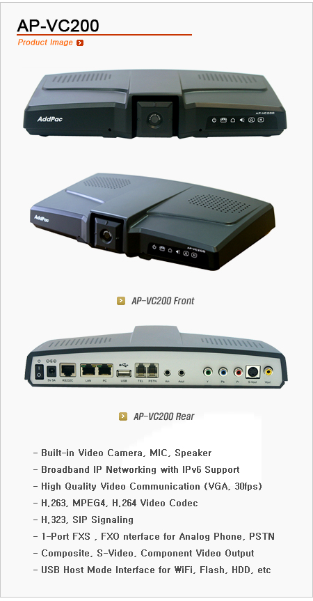 AP-VC200 ºñµð¿À ¿µ»óȸÀÇ Àåºñ´Â ±âÁ¸ TV³ª Àüȱ⸦ ¿¬°áÇØ ÀÎÅͳÝÀ¸·Î ¿µ»ó ¹× À½¼ºÅë½ÅÀ» Áö¿øÇÏ´Â »õ·Î¿î IP ºñµð¿À Ä¿¹Â´ÏÄÉÀÌ¼Ç ¼Ö·ç¼ÇÀÔ´Ï´Ù. ºñµð¿À Ä«¸Þ¶ó°¡ Àü¸éºÎ¿¡ ÀåÂøµÇ¾î ÀÖÀ¸¸ç Æß¿þ¾î ¾÷±×·¹À̵带 Áö¿øÇÏ´Â °í¼º´É DSP¸¦ ±â¹ÝÀ¸·Î ÃÖ½ÅÀÇ ¿Àµð¿À/ºñµð¿À ÄÚµ¦°ú ´Ù¾çÇÑ AV ÀÔÃâ·Â ÀÎÅÍÆäÀ̽º¸¦ ÅëÇØ ÀÎÅÍ³Ý ¿µ»óÀüÈ¿¡¼ºÎÅÍ ¿µ»óȸÀÇ, AV ¹æ¼Ûµ¿º¸, IPTV ¼ºñ½º±îÁö ÅëÇÕ Áö¿øÇÕ´Ï´Ù.