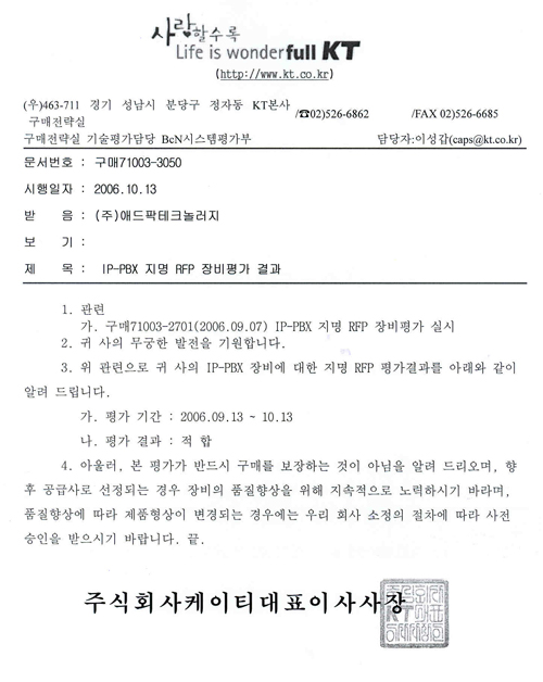¾ÖµåÆÅÅ×Å©³î·¯ÁöÀÇ IP-PBX °¡ ÃÖ±Ù ½Ç½ÃµÈ KT ±¸¸ÅÀü·«½Ç BcN ½Ã½ºÅÛ Æò°¡ºÎ IP-PBX Áö¸í RFP ÀåºñÆò°¡ BMT¸¦ Åë°úÇß´Ù.