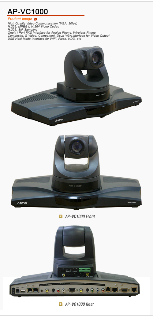 AP-VC1000Àº H.263/H.264/MPEG4 Æ®¸®Çà ºñµð¿À ÄÚµ¦À» Áö¿øÇÏ¸ç ¿µ»óÃâ·ÂÀ» À§ÇØ RCA ÀÎÅÍÆäÀ̽º¿Í, ºñµð¿À³ª TV ¿¬°áÀ» À§ÇÑ S-Video ÀÎÅÍÆäÀ̽º, RGB ÀÎÅÍÆä¾Æ½º ¹× (Y, Cr, Cb) Component(480P, 720P: 1280x720) ÀÎÅÍÆäÀ̽º¸¦ µ¿½Ã¿¡ Áö¿øÇØ Á¦ÇÑµÈ Å©±âÀÇ ¿µ»óÀüȰ¡ ¾Æ´Ñ ½Ã¿øÇÑ È¸é¿¡¼ Áñ±â´Â HD µð½ºÇ÷¹ÀÌ ¿µ»óÅë½ÅÀÌ °¡´ÉÇÕ´Ï´Ù. ¶ÇÇÑ ¾ÖµåÆÅÀÇ IP ÅÚ·¹Æ÷´Ï ¼Ö·ç¼Ç (IP-PBX, °¢Á¾ ¸ÖƼ¹Ìµð¾î ´Ü¸»±â, ºñµð¿À/¿Àµð¿À MCU, VoIP °ÔÀÌÆ®¿þÀÌ) µé°ú ¿¬µ¿ ±â´ÉÀ» Á¦°øÇØ »ç¿ëÀÇ Æí¸®¼º°ú È¿À²¼ºÀ» ±Ø´ëÈ ÇÏ¿´½À´Ï´Ù.
