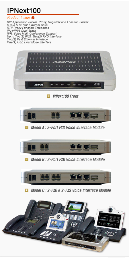 IPNext 100Àº Æß¿þ¾î ¾÷±×·¹À̵带 Áö¿øÇÏ´Â °í¼º´É ÀÓº£µðµå RISC¸¦ ±â¹ÝÀ¸·Î °³¹ßµÇ¾úÀ¸¸ç, ¼Ò±Ô¸ð »ç¾÷Àå¿¡ ÀÌ»óÀûÀÎ ÀÌ Á¦Ç°Àº ¾ÖµåÆÅÀÇ ´Ù¾çÇÑ VoIP ¹× ºñµð¿À ´Ü¸»±âµé°ú ¿¬µ¿µÇ¾î »ç¿ëÀÚ ¸Á¿¡ ÀûÇÕÇÑ ´Ù¾çÇÑ IP ÀÀ¿ë¼ºñ½º¸¦ Á¦°øÇÕ´Ï´Ù. IPNext100 Àº Àü¸éºÎ¿¡ ÀåºñÀÇ »óÅÂÇ¥½Ã LED µð½ºÇ÷¹À̸¦ Áö¿øÇÕ´Ï´Ù. ÈĸéºÎ¿¡´Â ¿É¼Ç¿¡ µû¶ó FXS, FXO VoIP ÀÎÅÍÆäÀ̽º¸¦ Áö¿øÇϰí, µÎ°³ÀÇ 10/100Mbps ÆÐ½ºÆ® ÀÌ´õ³Ý Æ÷Æ®, CLI(Command Line Interface) À§ÇÑ RS-232C ÄÜ¼Ö Æ÷Æ®, USB È£½ºÆ®¸ðµå ÀÎÅÍÆäÀ̽º Æ÷Æ®°¡ ÀÖ½À´Ï´Ù. ÈĸéºÎ¿¡ ÀÖ´Â VoIP °ÔÀÌÆ®¿þÀÌ ÀÎÅÍÆäÀ̽º´Â 2Æ÷Æ® FXO ¾Æ³¯·Î±× ±¹¼± ¹× 2Æ÷Æ® FXS ³»¼± VoIP ÀÎÅÍÆäÀ̽º Æ÷Æ®°¡ ÀåÂøµÉ ¼ö ÀÖÀ¸¸ç IP-PBX ±â´É ¿Ü¿¡ ¹Ìµð¾î °ÔÀÌÆ®¿þÀÌ ±â´ÉÀ» µ¿½Ã¿¡ ¼ö¿ëÇÒ ¼ö ÀÖ½À´Ï´Ù. ¶ÇÇÑ USB È£½ºÆ®¸ðµå Æ÷Æ®´Â USB ¸Þ¸ð¸® (USB HDD, USB Flash Memory) ¶Ç´Â USB ¹«¼±·£µî USB ±â¹ÝÀÇ ¸Þ¸ð¸® ¹× ³×Æ®¿öÅ© ÀÎÅÍÆäÀ̽º ÀåÄ¡¸¦ ¿¬°áÇÏ¿© ±âº»±â´É ¿Ü¿¡ IP-PBX ÀÇ ±â´ÉÀ» È®ÀåÇϴµ¥ »ç¿ëµÉ ¼ö ÀÖ½À´Ï´Ù.