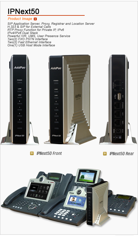 IPNext 50Àº Æß¿þ¾î ¾÷±×·¹À̵带 Áö¿øÇÏ´Â °í¼º´É ÀÓº£µðµå RISC¸¦ ±â¹ÝÀ¸·Î °³¹ßµÇ¾úÀ¸¸ç, ¼Ò±Ô¸ð »ç¾÷Àå¿¡ ÀÌ»óÀûÀÎ ÀÌ Á¦Ç°Àº ¾ÖµåÆÅÀÇ ´Ù¾çÇÑ VoIP ¹× ºñµð¿À ´Ü¸»±âµé°ú ¿¬µ¿µÇ¾î »ç¿ëÀÚ ¸Á¿¡ ÀûÇÕÇÑ ´Ù¾çÇÑ IP ÀÀ¿ë¼ºñ½º¸¦ Á¦°øÇÑ´Ù. IPNext50 Àº Àü¸éºÎ¿¡ ÀåºñÀÇ »óÅÂÇ¥½Ã LED µð½ºÇ÷¹À̸¦ Áö¿øÇϰí ÈĸéºÎ¿¡´Â 2-Æ÷Æ® FXO VoIP ÀÎÅÍÆäÀ̽º¸¦ Áö¿øÇϰí, µÎ°³ÀÇ 10/100Mbps ÆÐ½ºÆ® ÀÌ´õ³Ý Æ÷Æ®, CLI(Command Line Interface) À§ÇÑ RS-232C ÄÜ¼Ö Æ÷Æ®, USB È£½ºÆ®¸ðµå ÀÎÅÍÆäÀ̽º Æ÷Æ®°¡ ÀåÂøµÇ¾îÀÖ´Ù. USB È£½ºÆ®¸ðµå Æ÷Æ®´Â USB ¸Þ¸ð¸® (USB HDD, USB Flash Memory) ¶Ç´Â USB ¹«¼±·£µî USB ±â¹ÝÀÇ ¸Þ¸ð¸® ¹× ³×Æ®¿öÅ© ÀÎÅÍÆäÀ̽º ÀåÄ¡¸¦ ¿¬°áÇÏ¿© ±âº»±â´É ¿Ü¿¡ IP-PBX ÀÇ ±â´ÉÀ» È®ÀåÇϴµ¥ »ç¿ëµÉ ¼ö ÀÖ´Ù.