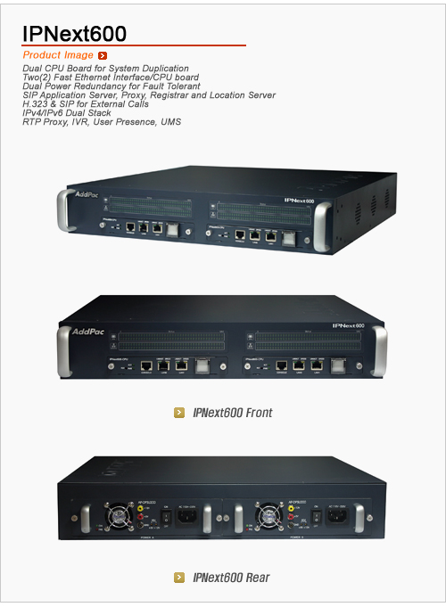 IPNext 600 Fault Tolerant IP-PBX ´Â ¾ÖµåÆÅÀÇ ´Ù¾çÇÑ »ç¿ëÀÚ Å͹̳ΠÀåºñ (AP-VP300, AP-VP280, AP-VP120 IP ¿µ»óÀüȱâ, AP-IP300, AP-IP150, AP-IP120 IPÀüȱâ, etc)¿Í ¿¬µ¿ÇÏ¿© ±âÁ¸ÀÇ À½¼º À§ÁÖÀÇ PBX ±â´ÉÀº ¹°·ÐÀÌ°í ¸ÖÆ¼¹Ìµð¾î ¿µ»ó, À½¼ºÅë½Å ¹× ¹æ¼ÛÀ» Áö¿øÇÏ´Â ALL IP ȯ°æÀÇ »õ·Î¿î IP Ä¿¹Â´ÏÄÉÀÌ¼Ç ¼Ö·ç¼ÇÀ» Áö¿øÇÑ´Ù. Æß¿þ¾î ¾÷±×·¹À̵带 Áö¿øÇÏ´Â °í¼º´É ÀÓº£µðµå RISC¸¦ ±â¹ÝÀ¸·Î ¼³°èµÇ¾úÀ¸¸ç, ȣó¸® ÇÁ·Î¼¼¼ÀÇ ÀÌÁßÈ, Å» ÀåÂø °¡´ÉÇÑ ¸ðµâ ±¸¼ºÀÇ Àü¿ø ÀÌÁßÈ ±â´É, °í¼Ó ÀÌ´õ³Ý ÀÌÁßÈÀ» Áö¿øÇÏ¿© ¾ÈÁ¤¼ºÀ» ¿øÇÏ´Â Áß¼ÒÇü »ç¾÷Àå¿¡ ÀûÇÕÇÑ Á¦Ç°ÀÌ¸ç ¾ÖµåÆÅÀÇ ´Ù¾çÇÑ VoIP ¹× ºñµð¿À Á¦Ç°µé°ú ¿¬µ¿µÇ¾î »ç¿ëÀÚ ¸Á¿¡ ÀûÇÕÇÑ ´Ù¾çÇÑ IP ÀÀ¿ë¼ºñ½º¸¦ Á¦°øÇÒ ¼ö ÀÖ´Ù.