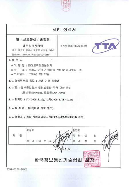 TTA Æò°¡´Â IP-PBXÀÇ SIP±â¹Ý ȣó¸® ¼º´É, ±¹°¡Ç¥ÁØ ¾Æ¸®¾Æ(ARIA) ¹× ±¹Á¦Ç¥ÁØ AES ¾ÏÈ£È ¾Ë°í¸®Áò ±â¹Ý º¸¾È±â´É, Á¦Ç° ȣȯ¼º µî ÃÑ 3°³ Ç׸ñÀ¸·Î ÁøÇàµÆÀ¸¸ç, ÀÎÁõ½ÃÇèÀ» Åë°úÇÑ Á¦Ç°Àº ¿£ÅÍÇÁ¶óÀÌÁî±Þ IPNext10000 IP-PBX ¹× AP-VP120 ¿µ»ó ÀÎÅͳÝÀüȱâ, AP-IP300 °í±ÞÇü À½¼º IP ÀÎÅͳÝÀüȱâ, AP-IP120 À½¼ºIPÀÎÅÍ³Ý Àüȱâ 4Á¾ÀÌ´Ù. AP-IP300 Àº User Presence ±â´ÉÀ» Áö¿øÇÏ´Â 25°³ÀÇ ´ÜÃà´ÙÀ̾ó ¹× 4.3ÀÎÄ¡ Ä÷¯LCD¸¦ Á¦°øÇϰí, AP-IP120 12°³ÀÇ ´ÜÃà´ÙÀ̾óÀ» Áö¿øÇÑ´Ù. À̹ø¿¡ ÀÎÁõ½ÃÇè¿¡ Åë°úÇÑ IP ´Ü¸»µéÀº ¸ðµÎ PoE ±â´ÉÀ» Á¦°øÇÕ´Ï´Ù..