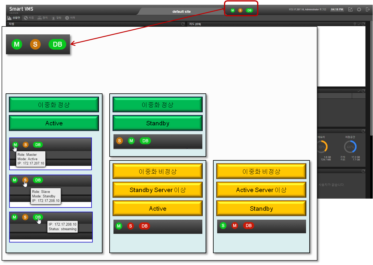 ¿î¿µÀÚ°¡ SNC CLIENT¿¡ ·Î±×ÀÎÇÏ¸é ¿ìÃø »ó´Ü¿¡ 3°³ÀÇ ¾ÆÀÌÄÜÀÌ Á¸ÀçÇϸç ÀÌ´Â °¢°¢ ÀÚ½ÅÀÇ »óÅÂ, »ó´ë Ãø »óÅÂ, µ¥ÀÌÅͺ£À̽º »óŸ¦ º¸¿©ÁÝ´Ï´Ù. ¾Æ·¡ ±×¸²¿¡¼ ÀÚ½ÅÀº Master, Active ÀÓÀ» º¸¿©ÁÖ°í »ó´ë´Â Slave, Standby ÀÌ°í µ¥ÀÌÅͺ£À̽º ÀÌÁßÈ´Â Á¤»óÀÓÀ» º¸¿©ÁÝ´Ï´Ù.