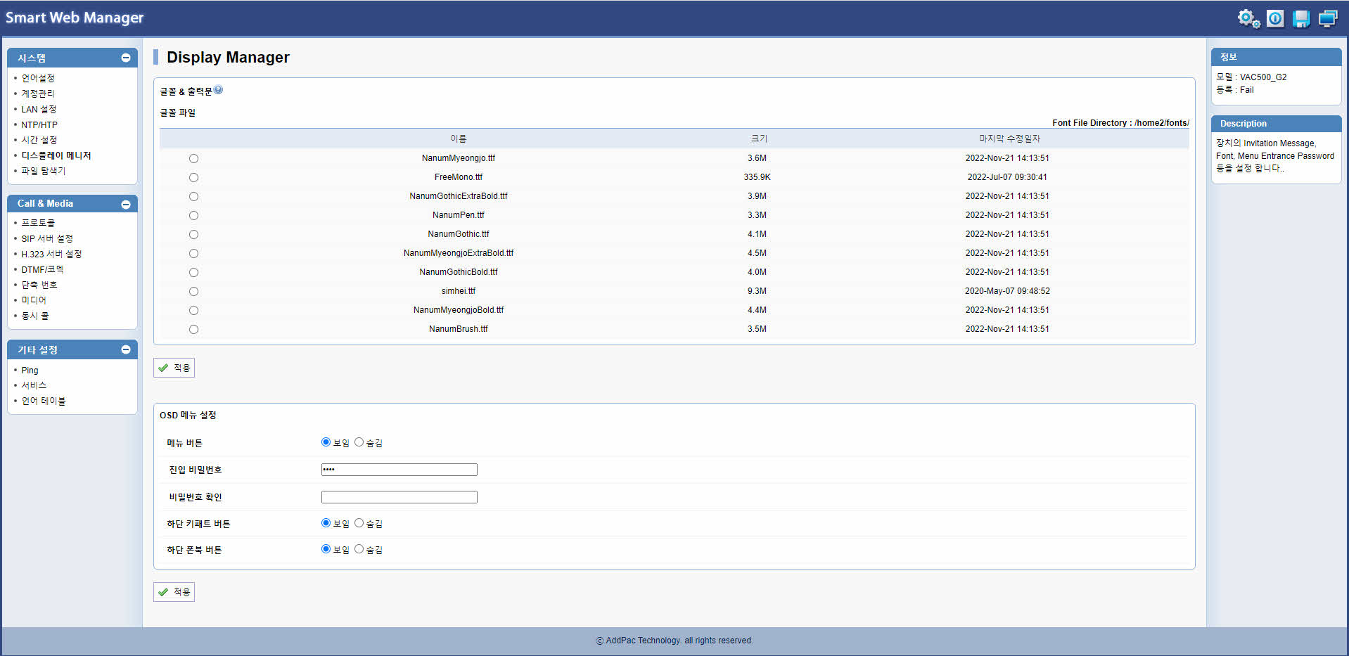 AP-VAC320 ¹«Àνü³¿ë SIP ¿µ»óÅëÈÀåÄ¡´Â º¸¾È±â´ÉÀ» °ÈÇϱâ À§Çؼ Æß¿þ¾î ¾÷±×·¹À̵带 ÅëÇØ TLS1.2 ±â¹ÝÀÇ HTTP ½ÃÅ¥¸®Æ¼ ÇÁ·ÎÅäÄÝ (HTTPS, WebSocket, PHP/FastCGI), ½ÃÅ¥¸®Æ¼ Shell (SSH Server, SFTP Server) ±â´É, RFC2385 TCP MD5 Signature, °ÈµÈ ÆÐ½º¿öµå ±â´ÉµîÀ» Áö¿øÇÕ´Ï´Ù.