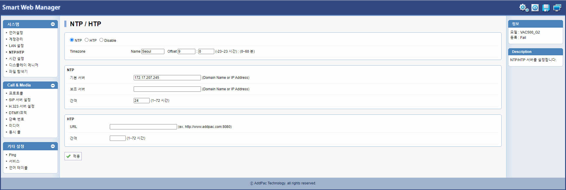 AP-VAC320 7ÀÎÄ¡±Þ ÅÍÄ¡½ºÅ©¸° LCD ±â¹Ý SIP ºñµð¿À ÀÎÅÍÆùÀº ½Ã°¢µ¿±â ±â´ÉÀ» À§ÇÑ NTP (Network Time Protocol), HTP (HTTP Time Protocol) ÇÁ·ÎÅäÄÝ ±â´ÉÀ» Áö¿øÇÕ´Ï´Ù. ³»ºÎ¸Á¿¡ À§Ä¡ÇÑ GPS NTP ŸÀÓ¼¹ö¿Í ½Ç½Ã°£À¸·Î ¿¬µ¿ÇÏ¿© ÀåºñÀÚüÀÇ ½Ã°£À» ¸ÂÃß´Â ±â´ÉÀ» Áö¿øÇÕ´Ï´Ù. HTP ´Â ³»ºÎ¸Á¿¡ À§Ä¡ÇÑ ¿ÜºÎÀÇ À¥¼¹ö¿ÍÀÇ ¿¬µ¿À» ÅëÇØ¼ HTTP ÇÁ·ÎÅäÄÝÀ» »ç¿ëÇÏ¿© ½Ã°¢Á¤º¸À» ȹµæÇÏ´Â ÇÁ·ÎÅäÄÝÀÔ´Ï´Ù. GPS NTP ½Ã°¢µ¿±â ¼¹ö°¡ ¾ø´Â°æ¿ì¿¡ ´ë¾ÈÀÌ µÉ¼ö ÀÖ½À´Ï´Ù.