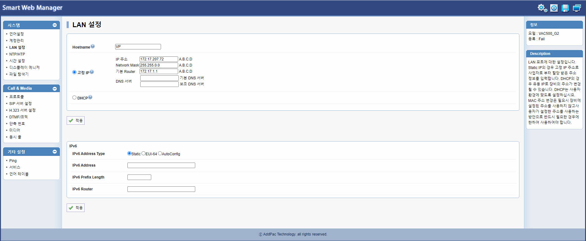 AP-VAC320 7ÀÎÄ¡±Þ SIP ºñµð¿À ÀÎÅÍÆù À§ÇÑ IP ¾îµå·¹½º ¹öÁ¯4 (IPv4) ¿Ü¿¡ IP ¾îµå·¹½º ¹öÁ¯6(IPv6) ¼³Á¤ ±â´ÉÀ» Áö¿øÇÕ´Ï´Ù. ÅÚ³ÝÀ» ÅëÇÑ ³×Æ®¿öÅ© Àåºñ ¾÷°è¿¡ Ç¥ÁØÃ³·³ »ç¿ëÇÏ´Â CLI(Command Line Interface) ¹× AP-VAC320 ¿î¿µ°ü¸® ¼ÒÇÁÆ®¿þ¾îÀÎ ½º¸¶Æ® À¥ ¸Þ´ÏÁ® (Smart Web Manager) ¼ÒÇÁÆ®¿þ¾î¿¡¼ Áö¿øÇÕ´Ï´Ù. ½º¸¶Æ®À¥¸Þ´ÏÁ® ¼ÒÇÁÆ®¿þ¾îÀÇ ½Ã½ºÅÛ¼³Á¤¸Þ´º¿¡¼ LAN ¼³Á¤¿¡ µé¾î°¡¸é »ó´Ü¿¡ IP ¾îµå·¡½º ¹öÁ¯4, ÇÏ´Ü¿¡´Â IP ¾îµå·¹½º ¹öÁ¯6¿¡ ´ëÇÑ ¼³Á¤À» Áö¿øÇÕ´Ï´Ù.